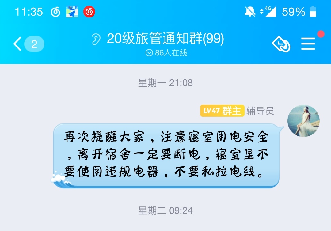 积极落实“零点”汇报制度,各年级各专业以班级为单位,寝室长为监督负责人,每晚23:00辅导员通过“今日校园”了解学生在寝情况,及时掌握学生晚归不归或等情况。为切实加强20级旅游管理专业学生就业安全教育,赵佳慧通过事务性班会、QQ群通知等提醒大家注意冬季寝室用电防火安全及寝室卫生。地旅91论坛