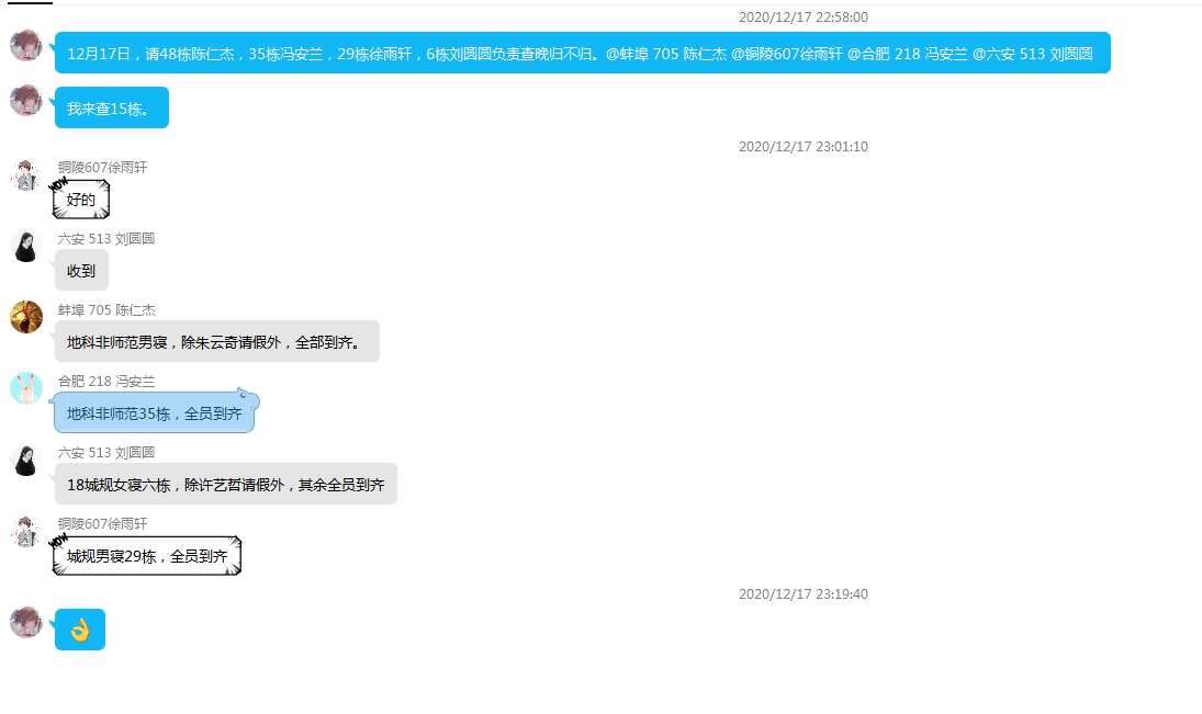 查寝情况,强调了寝室安全和卫生的重要性。她表示,寝室长要做好提醒工作:出门关电源、晨午晚测温、按时健康打卡、及时完成线上晚点名;寝室长还需如实报备寝室成员状况,定期开展卫生打扫和安全排查工作,确保每位同学的安全。后期将会安排生活委员、安全委员等班委进行晚归不归突击查寝,并不定期检查每个寝室的卫生状况。