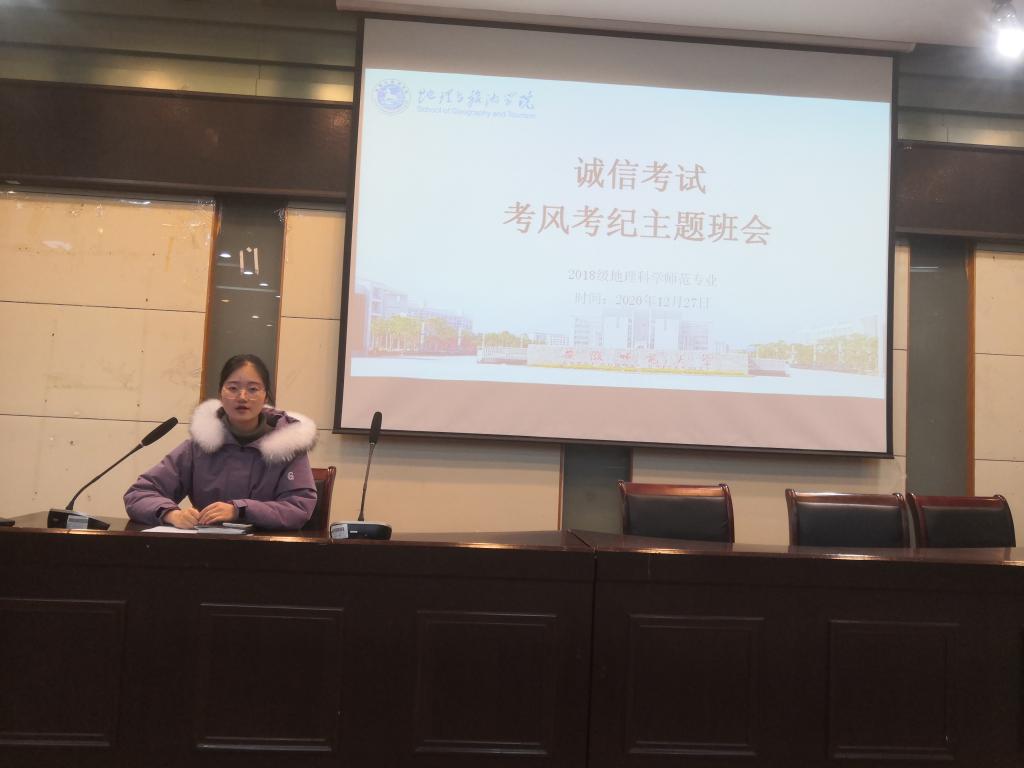 丁茹栩 罗文菁)营造考试氛围,强化法纪观念。2020年12月27日晚上七点半,2018级地理科学(师范)专业考风考纪教育主题班会在地旅实验楼101报告厅顺利举行。班会由辅导员丁茹栩主持。