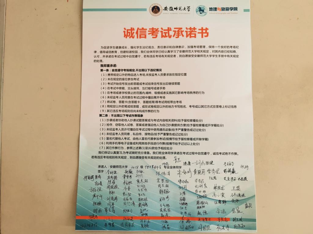 教务系统查询考试的具体安排,不要出现记错考试时间,跑错考场的现象。会议最后,每个同学依次在诚信考试承诺书上签好了自己的姓名,并承诺在考试过程中自觉遵守考试纪律,绝不出现舞弊行为,若有任何违反考场规则的行为,自愿接受规定的处理。