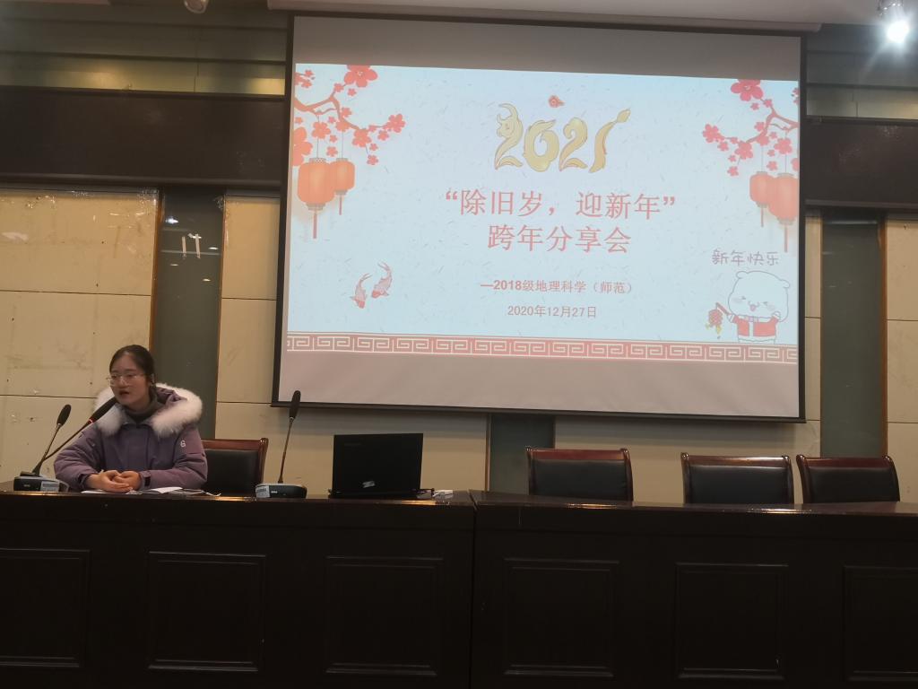 丁茹栩 罗文菁)万象更新迎牛年,齐心协力谱新篇。2020年12月27日晚上七点半,2018级地理科学(师范)专业“除旧岁,迎新年”跨年分享会在地旅实验楼101报告厅顺利举行。班会由辅导员丁茹栩主持。