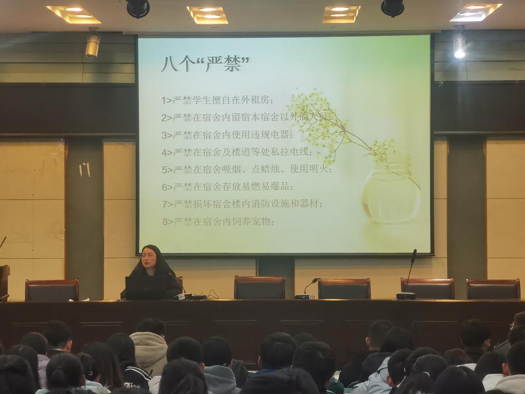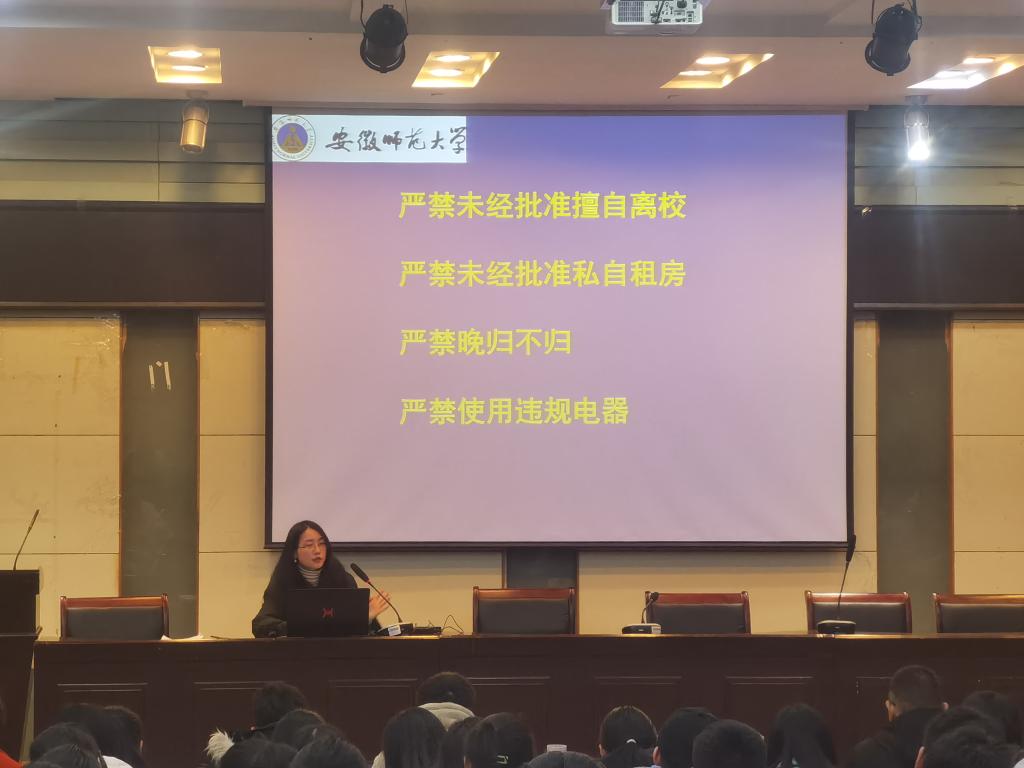 接着彭媛媛指出新学期四项禁令依是我们不能触碰的高压线,并带着同学们一起重温四项禁令”严禁晚归不归,严禁擅自离校,严禁使用违规电器,严禁私自租房“,除此之外还提醒同学们要遵守疫情防控规定、晚点名、请销假等还纪律要求,严禁在寝室违规用电,做到人走断电,注意寝室卫生,构建文明和谐的寝室环境