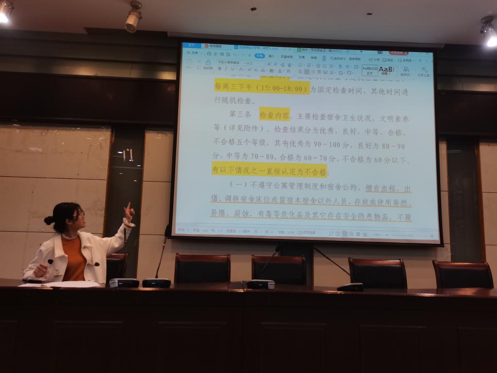 随后,丁茹栩就检查内容进行展开,要求同学们严格遵守《学生宿舍评分标准》来营造舒适的寝室环境,并指出宿舍必须杜绝私拉电线、使用违禁电器等行为,同时要积极改善宿舍卫生状况,做好宿舍的通风工作。