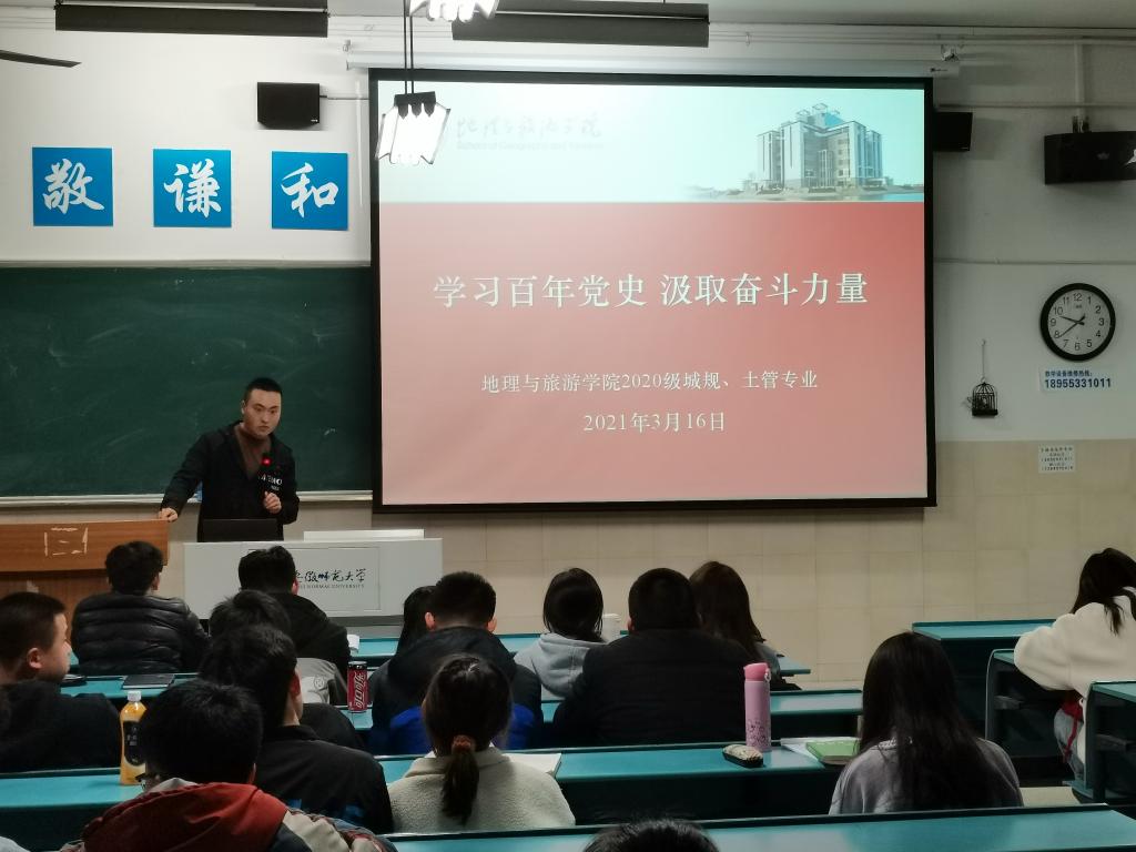 刘少杰 陆峻然) 为贯彻落实习近平总书记在党史学习教育动员大会上的重要讲话精神,引领广大同学学史明理、学史增信、学史崇德、学史力行,2021年3月16日晚,20级土地资源管理、20级城乡规划开展党史学习教育主题教育。此次党史学习教育主题教育主要包括:党史学习教育主题班会,集体观看红色影视作品,团员分享党史学习教育心得。