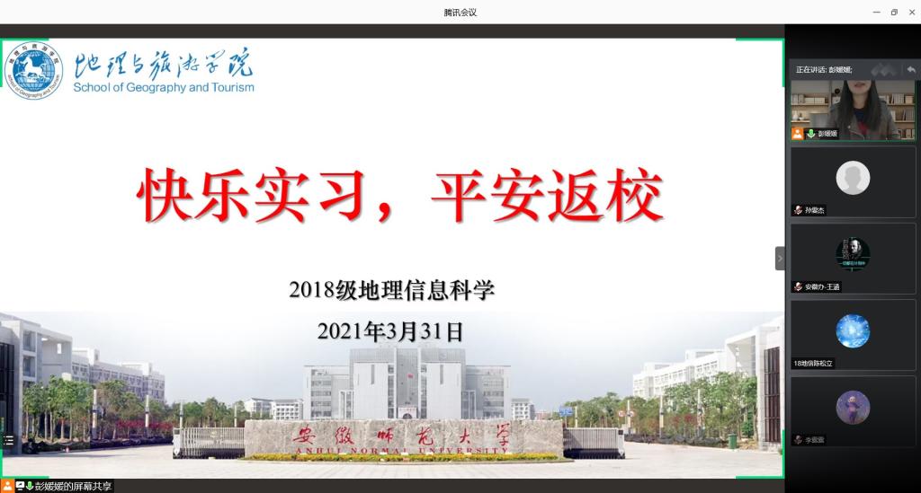 本网讯(孙雯杰 彭媛媛)实习生涯已进行一周,为加强同学们清明安全与实习安全思想教育,提醒接种疫苗相关事项,2018级地理信息科学专业于2021年3月31晚上9:00腾讯会议开展清明假期与实习安全暨接种疫苗政策宣讲线上主题班会班会由辅导员彭媛媛主持,2018级地理信息科学专业全体同学参与。