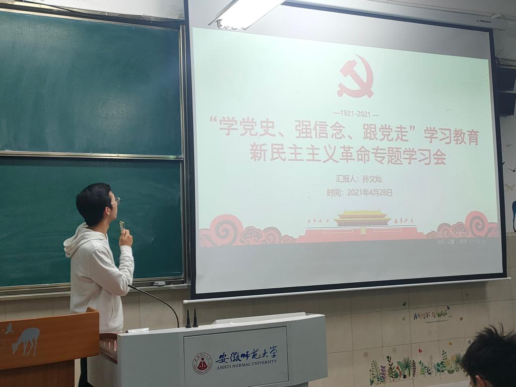 本网讯(孙文灿 彭媛媛)为进一步做好党史学习教育,引领广大青年团员学党史、强信念、跟党走,2020级地理科学类专业一班团支部于4月28日晚19:30在行知楼2040202开展新民主主义革命专题学习会。本次专题学习会以支部大会的形式召开,由团支书孙文灿主持主讲,2020级地理科学类专业一班全体学生参加。