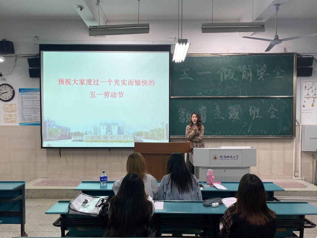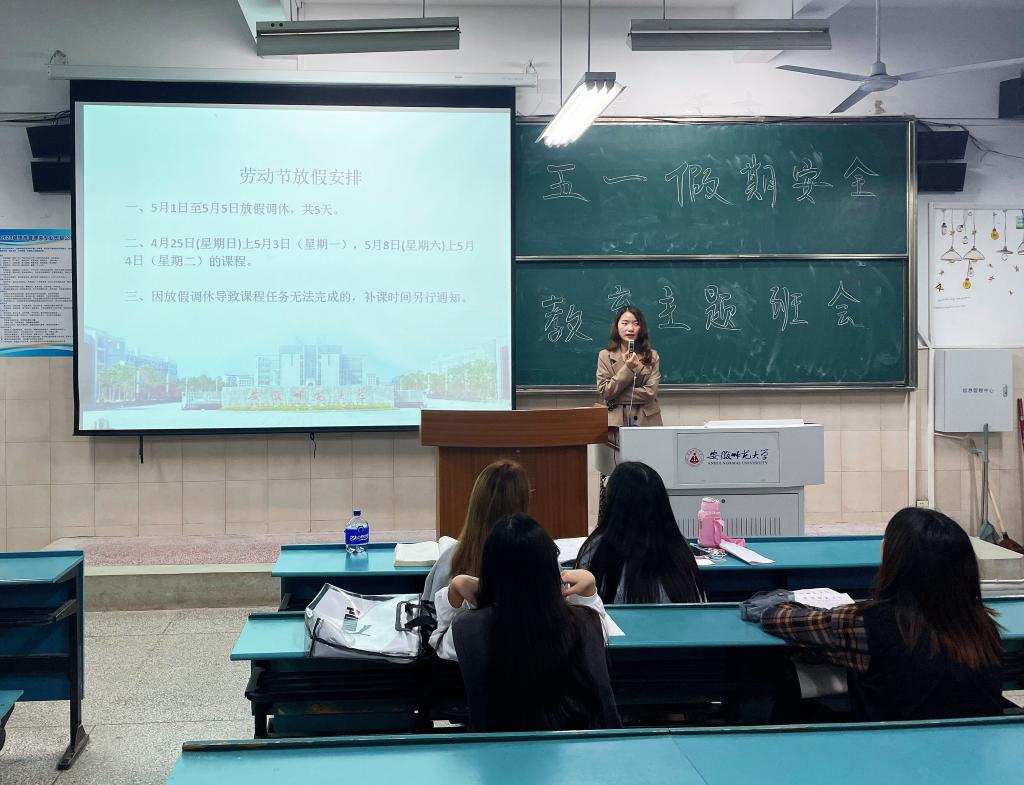 赵佳慧 孙云峰)安全离校,你我同行。为了提高学生的安全意识,确保同学们的离校行程安全,同时也为做好五一劳动节放假期间本科生安全教育管理工作,4月28日晚7点,20级旅游管理专业在行知楼4号楼203教室召开了“五一假期安全教育”主题班会,会议由20级旅游管理专业的辅导员赵佳慧主持,20级旅游管理专业全体学生参与。
