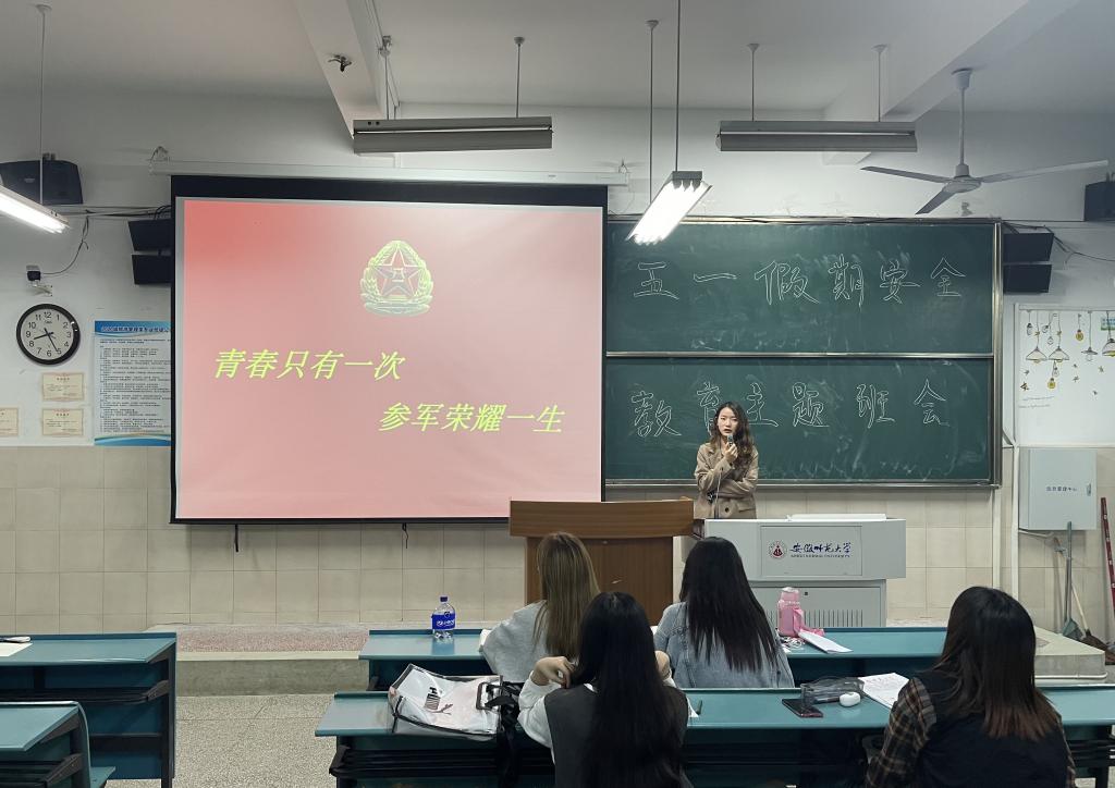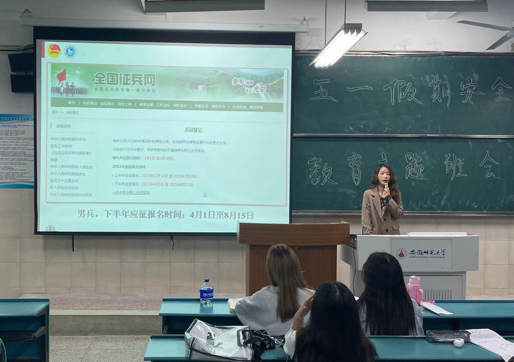 赵佳慧 孙云峰)投笔从戎,报效祖国。为加强同学们对国家征兵入伍优惠政策的了解,鼓励同学们积极报名入伍,同时增强同学们的爱国信念,4月28日晚,2020级旅游管理专业于行知楼4号楼203教室召开以“参军入伍 无上光荣”为主题的班会,班会由20级旅游管理专业辅导员赵佳慧主持,20级旅游管理的全体同学们参与了此次班会。