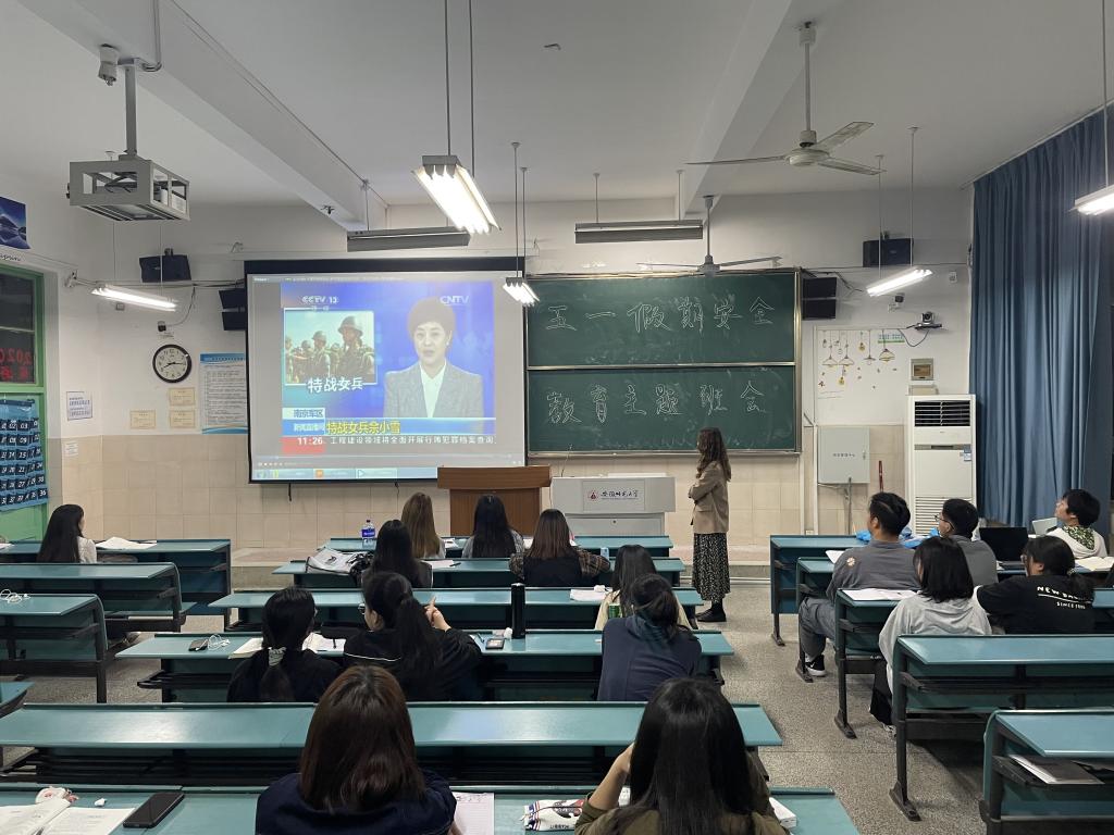 班会一开始,赵佳慧向同学们介绍大学生应征入伍的优惠政策,除家庭按规定享受军属待遇外,还享受优先选拔使用、学费补偿和国家助学贷款代偿、退役后考学升学优惠、就业服务等政策,鼓励同学们积极应征入伍。同时,赵佳慧强调大学生优先征集入伍,学校对入伍的同学保留两年的学籍,对于之后的考研、考公也有一定帮助。班会中途,赵佳慧为同学们放映了两段关于国家入伍士兵的小视频,视频弘扬了参军报国的正能量,让同学们充分了解了大学生入伍的重要意义。班会的最后,赵佳慧还介绍了大学生入伍的流程及相关的注意事项,包括宣传报名、体检政考、定兵入伍等具体的流程。