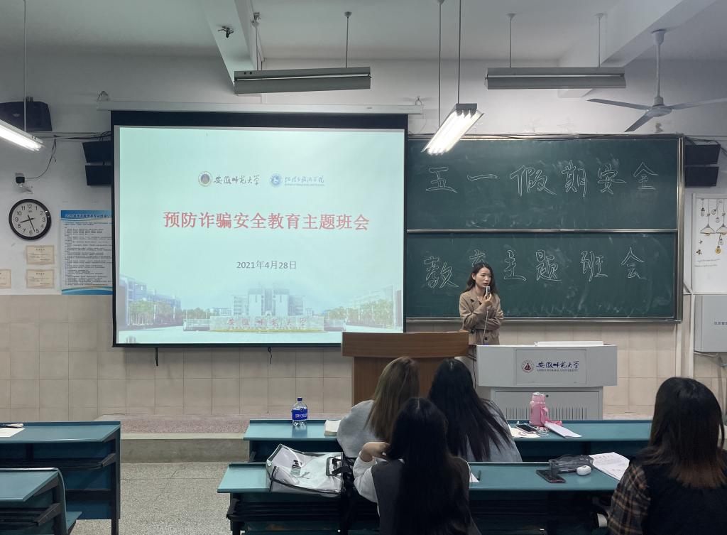 赵佳慧 孙云峰)安全校园,预防在先。为进一步加强学生的安全教育管理,提高学生的防诈骗意识,同时营造平安和谐稳定的校园环境,4月28日,20级旅游管理专业辅导员赵佳慧在行知楼4号楼203教室召开了以“防诈骗”为主题的安全教育班会,20级旅游管理的全体同学参与此次班会。