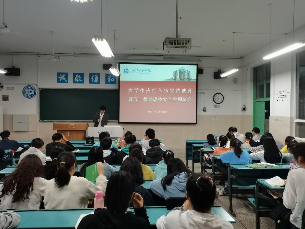 刘少杰 袁明峻 陆峻然)为号召青年学生携笔从戎,参军报国,为实现中国梦、强军梦贡献力量。4月28日晚,2020级土地资源管理和2020级城乡规划专业召开大学生应征入伍宣传教育主题班会。会议由辅导员刘少杰主持,2020级土地资源管理与2020级城乡规划专业的全体同学参加了此次班会。