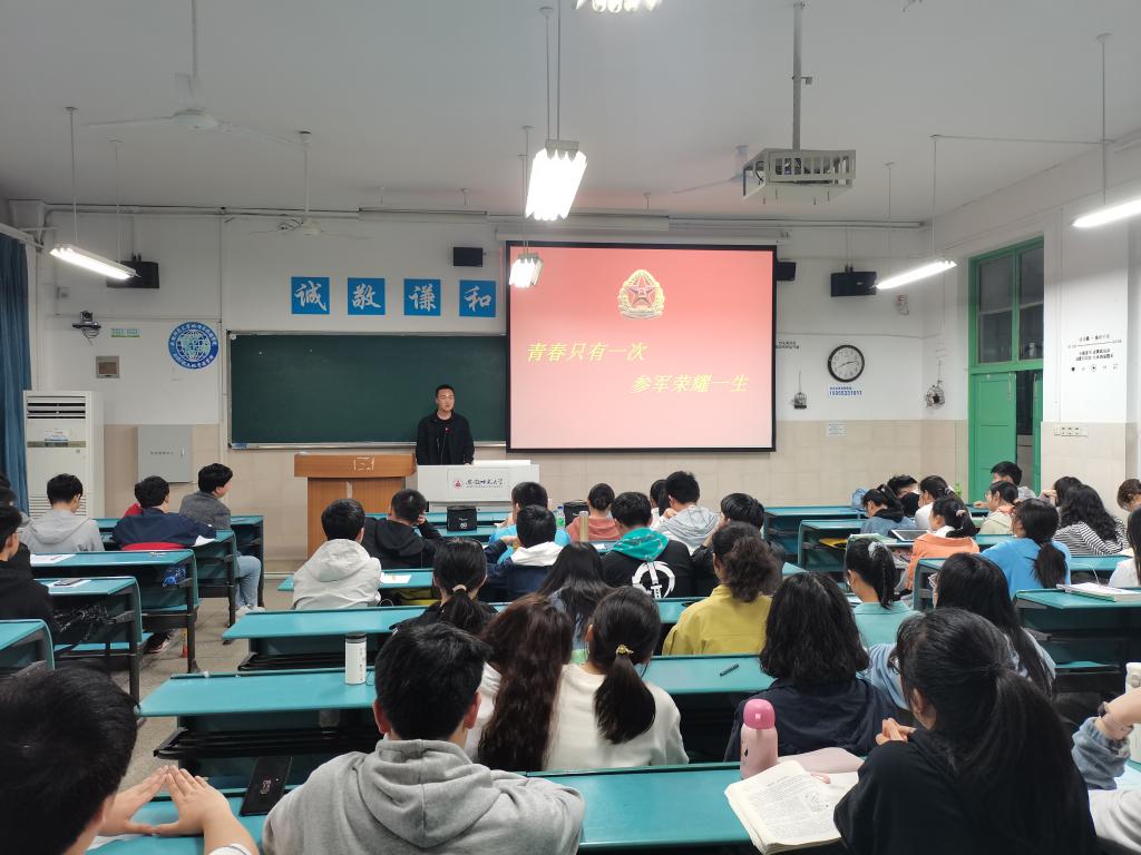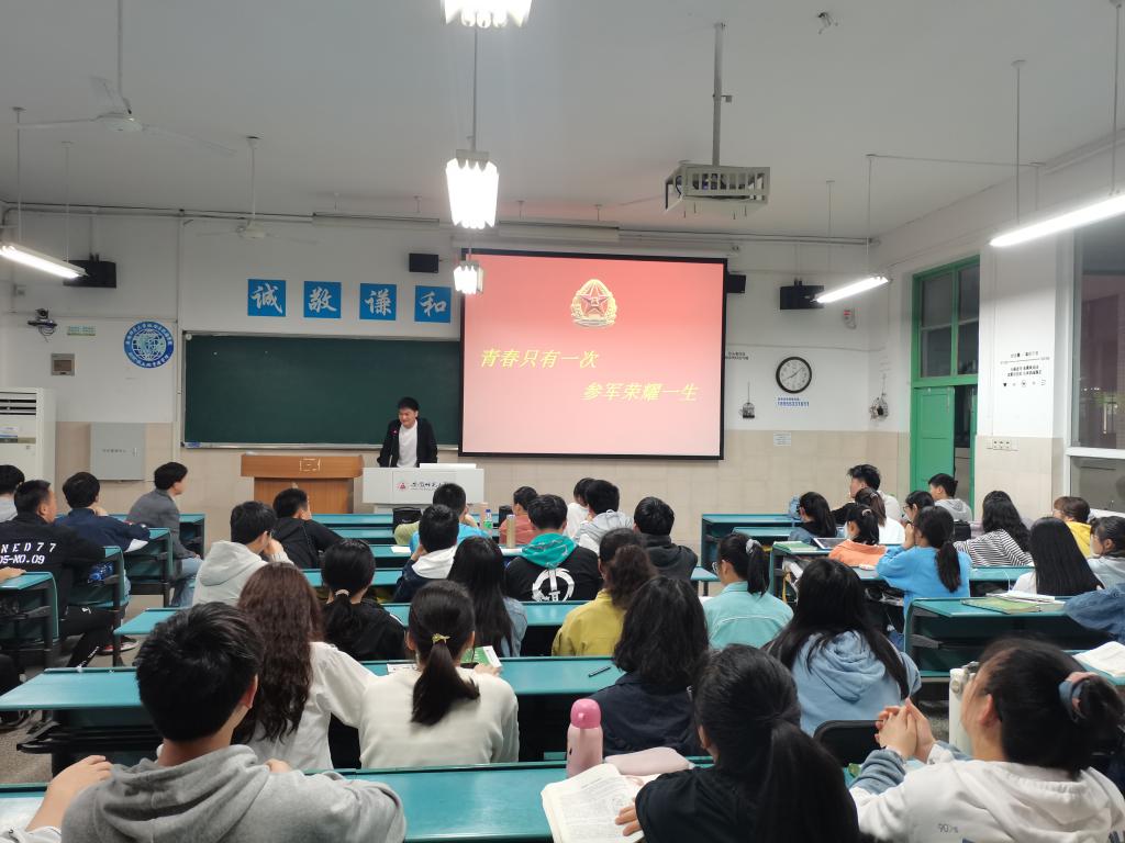 历来高度重视大学生征兵工作,通过班级召开主题班会等形式,扎实推进学生国防理论教育、大学生应征入伍宣传,将理论学习与社会实践相结合,对学生进行全方位培养锻炼,坚定理想信念,不断发挥引领全院学生成长成才的先锋模范作用。