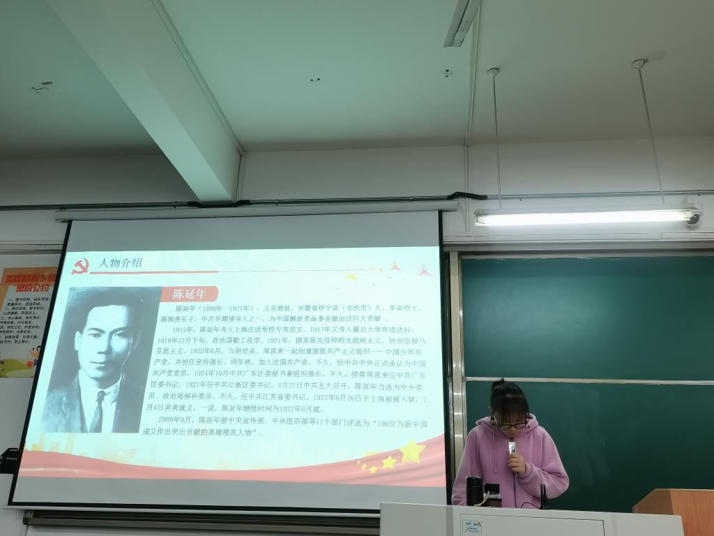 首先徐嘉祺同学在党史授课中向大家详细介绍了陈延年、陈乔年兄弟,谷文昌和焦裕禄四位优秀党员的感人故事和英勇事迹: