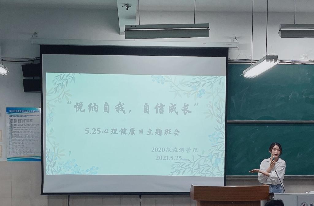 臧梦瑶)“5·25,我爱我”。为进一步促进20级旅游管理专业同学们的身心健康发展,同时为宣传普及心理健康知识,从而深入开展心理健康教育,20级旅游管理专业于5月25日晚在行知楼4号楼203教室开展以“悦纳自我,自信成长”为主题的心理健康日主题班会。本次班会由辅导员赵佳慧主持,20级旅游管理专业全体学生参与。