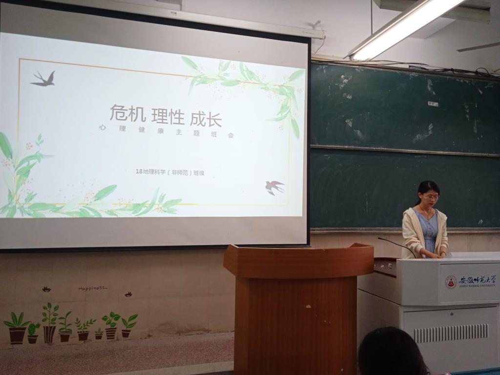 5月24日下午,2018级地理科学(非师范)专业“危机 理性 成长”心理健康主题班会在行知楼4号103教室顺利举行。班会由心理委员吴净主持,2018级地理科学(非师范)专业全体同学参加。