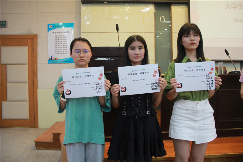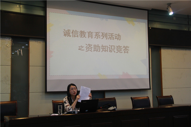 会议第二项,诚信教育系列活动之资助知识竞答。彭媛媛老师给出了20个与大学生资助诚信有关的题目,鼓励在场同学积极举手回答,每个答对的同学都获得了老师精心准备的小礼品。