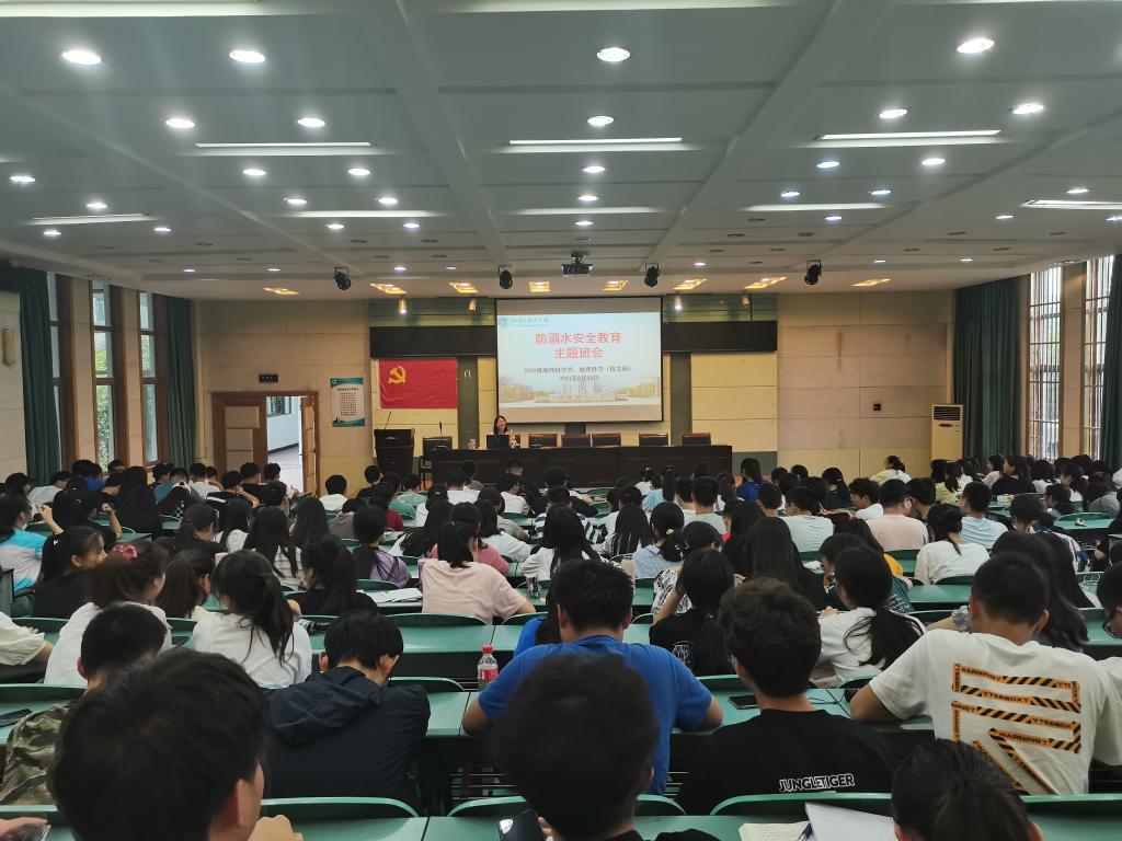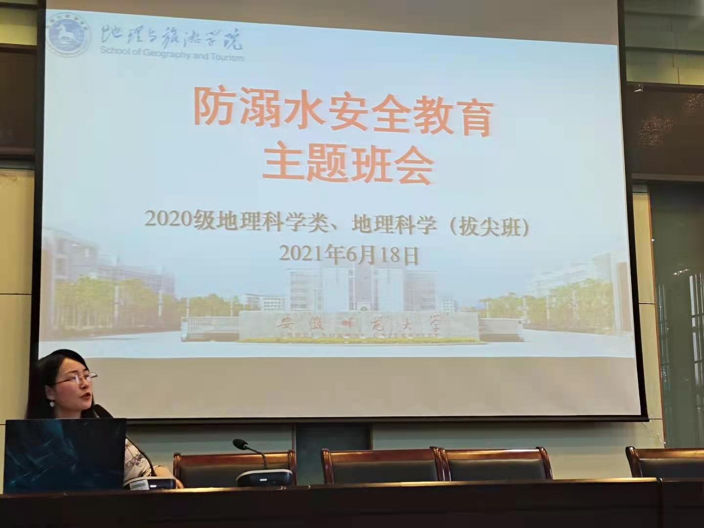 任家俊 彭媛媛)为使同学们了解防溺水安全知识的有关内容,提高每一位同学们的安全意识,抓好学生溺水安全教育工作,提高学生自防、自护、自救的能力,2021年6月18日,2020级地理科学类、地理科学(拔尖班)在地旅实验楼101报告厅开展防溺水安全教育主题班会,会议由辅导员彭媛媛主持,2020级地理科学(拔尖班)、地理科学类所有同学参加会议。