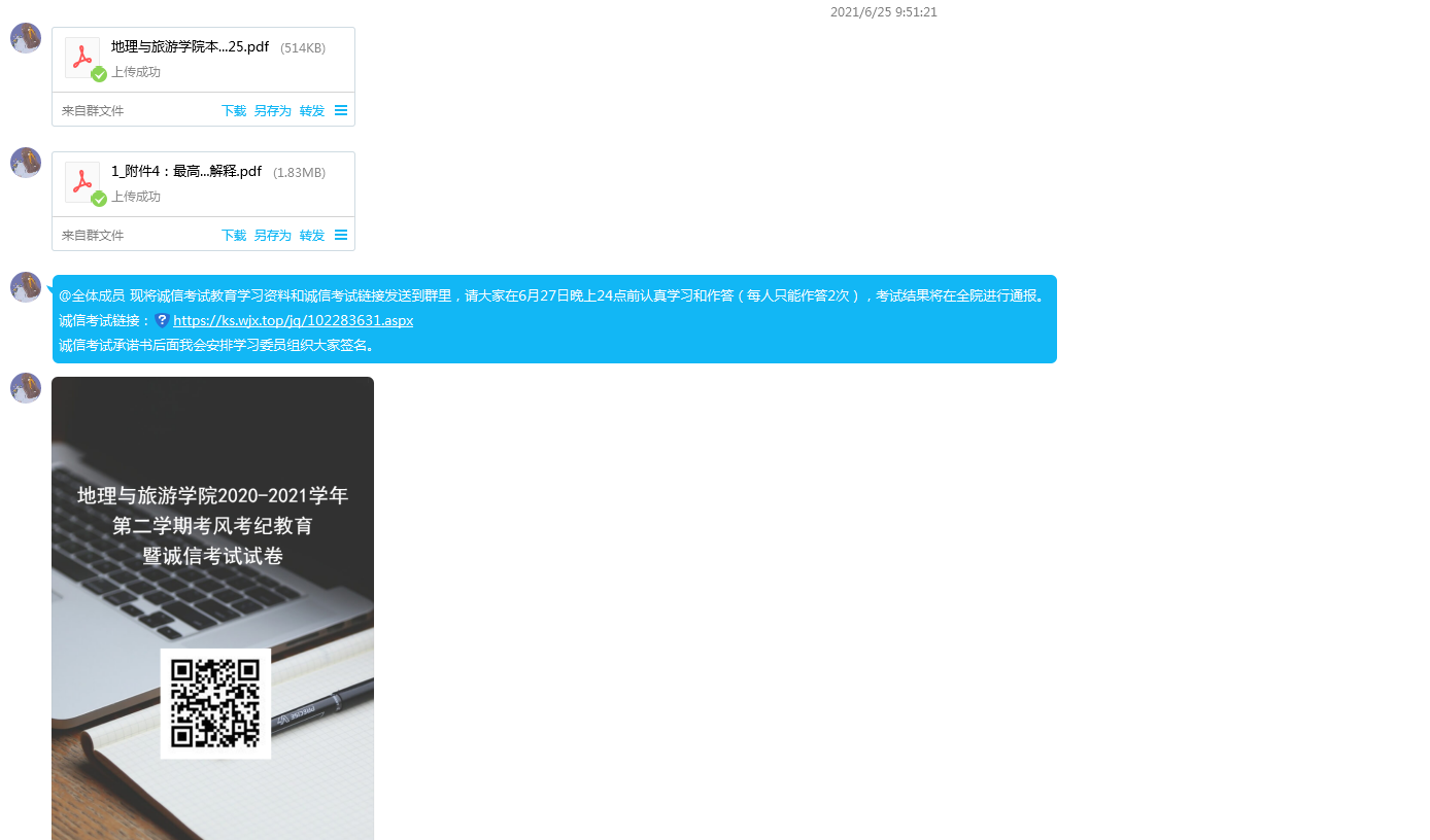 学生手册》53—55页内容及群文件中的相关法条,号召同学们严于律己、诚信考试,不做违反校规校纪的事。她还提醒同学们做好复习安排,合理规划,劳逸结合,在复习的同时照顾好身体,考试时要带好考试相关用品,检查无误后再交卷。此外,班级同学还完成了线上诚信考试答题与线下诚信考试承诺书签名。