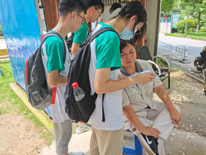 在参观过后,队员们在附近的社区着手开展问卷调研活动。团队共分成四组(两组纸质问卷调研,两组电子问卷调研),每组二至三个队员,分头展开行动。问卷调研的过程并不是一帆风顺的,尽管队员们在调查时是秉持着避免耽误,打扰到被调研人员的原则,选择不在忙碌状态下的人进行访问,但仍是多次被拒。不过队员们并没有灰心,不顾炎热和辛苦,一直在沿路找寻,耐心询问,礼貌问答,最终还是圆满完成了此次问卷调研任务,调研结果也将在后期进行整理和统计。