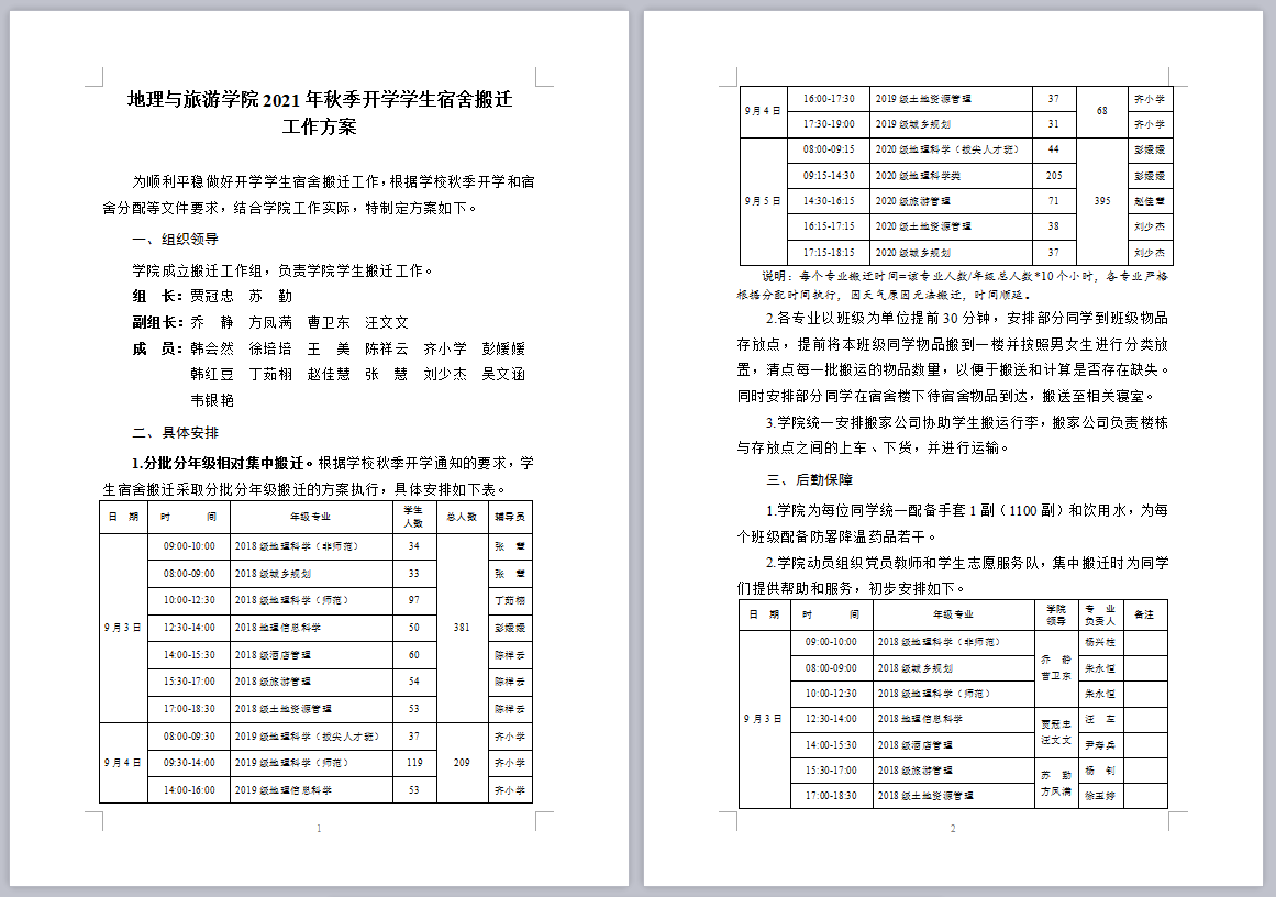 2021年秋季开学学生宿舍搬迁工作方案》,方案确定了搬迁工作领导组、责任分工、日程安排、后勤保障、工作要求等内容,对具体的搬迁进度和重点事项进行了明确分工和责任落实。各班级辅导员在学生返校前开展线上主题班会解答和布置返校宿舍搬迁问题,确保学生在返校前就明确返校任务和搬迁流程。