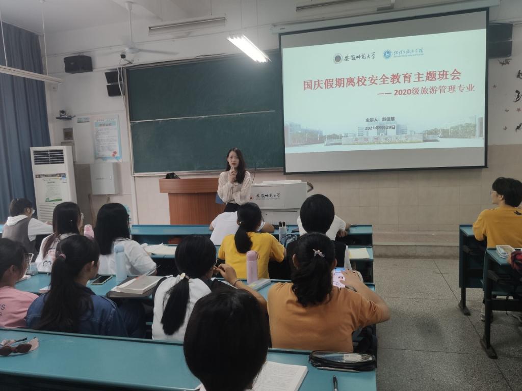 赵佳慧 舒玉茹)十一假期即将到来,为强化疫情防控主题,响应学校防疫政策,维护校园安全稳定,进一步增强学生的安全意识和防护意识,9月29日,2020级旅游管理专业召开国庆假期离校安全教育主题班会。班会由辅导员赵佳慧老师主持,2020级旅游管理专业全体同学参加。