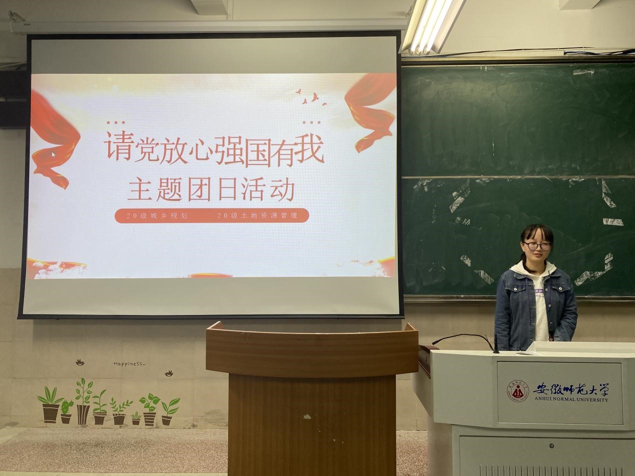 刘少杰 耿艺榕)为庆祝中国共产党成立100周年, 10月17日晚, 20级城乡规划和20级土地资源管理召开“请党放心,强国有我”主题团日活动,本次团日活动由20级城乡规划专业团支书徐嘉祺主持,全体同学参与。