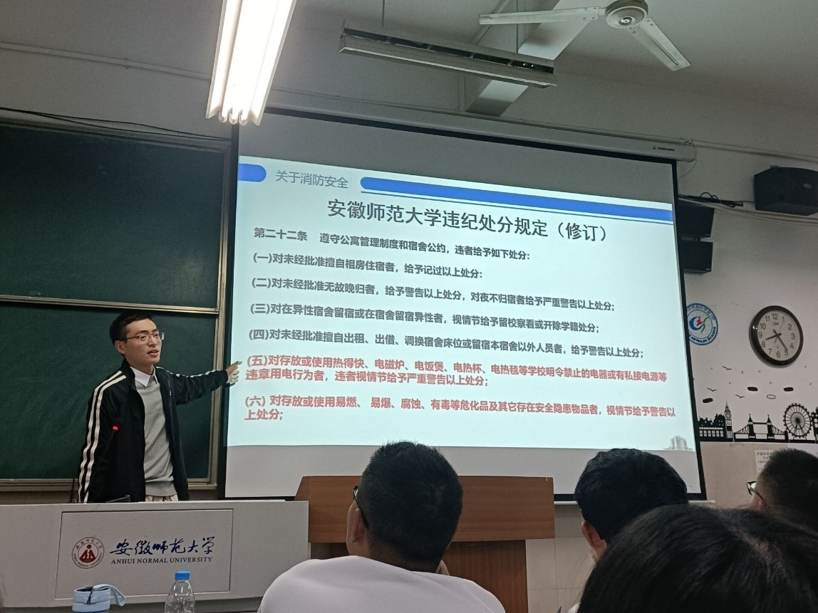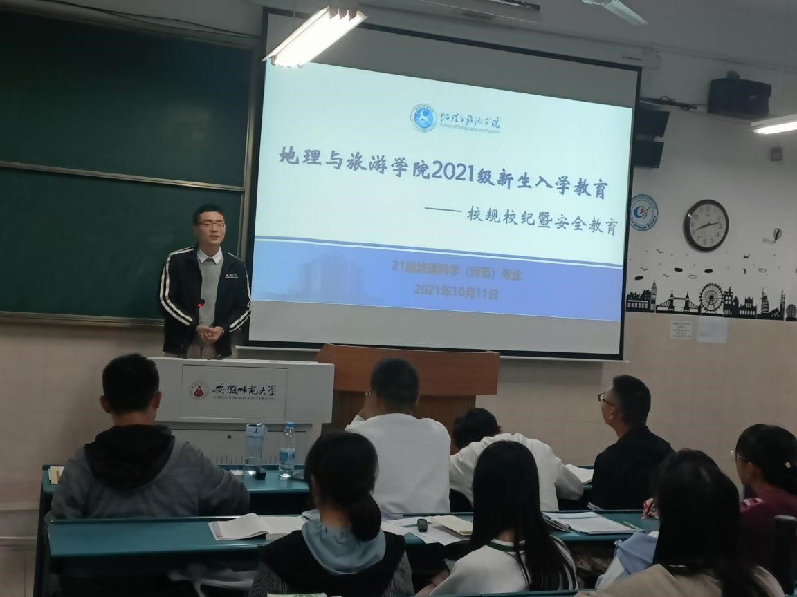 韩红豆 王彩安)为加强学生日常管理,切实增强学生的安全防范意识和避险能力,10月11日晚,2021级地理科学(师范)专业在行知楼2040204召开新生入学安全教育班会。会议由辅导员韩红豆主持,21级地理科学(师范)全体同学参加。