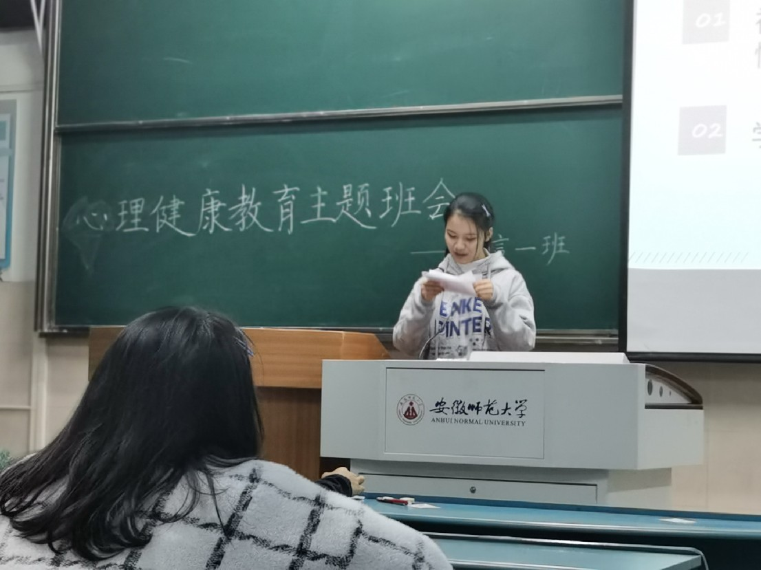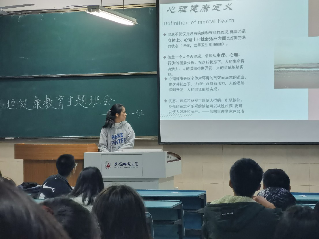 首先,邱欣瑶同学向同学们说明了心理健康的含义,并从当代大学生所面临的四个主要心理问题:社交与情感问题、学业问题、特殊群众问题、网络成瘾问题等方面进行介绍,并结合具体案例剖析问题根源。