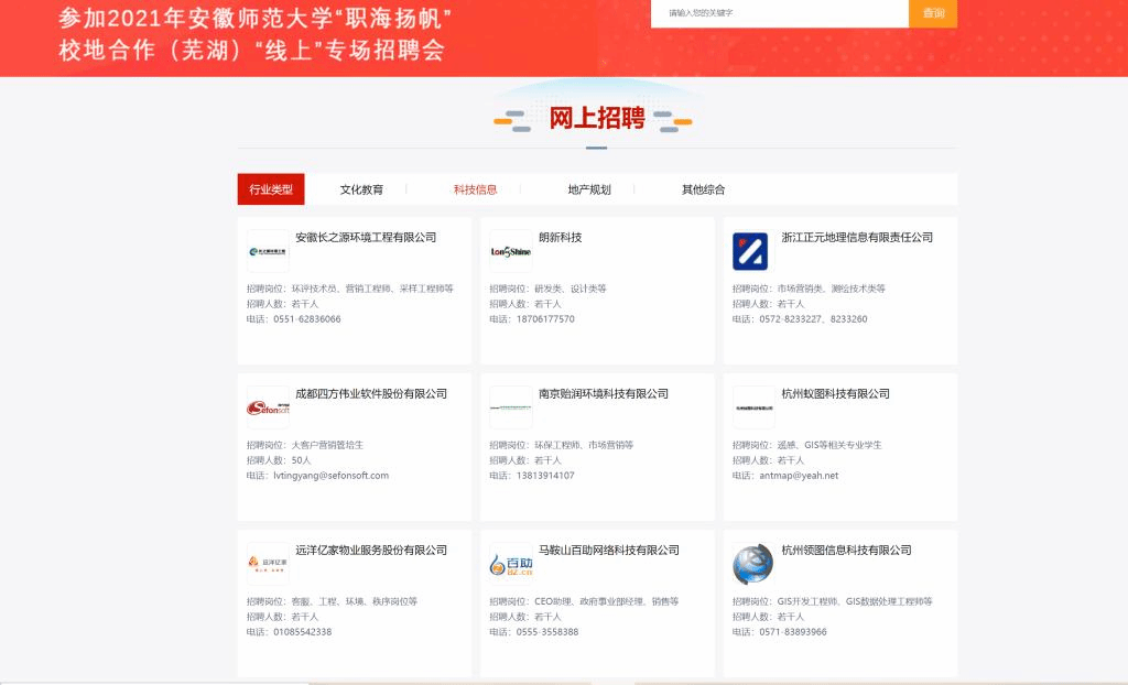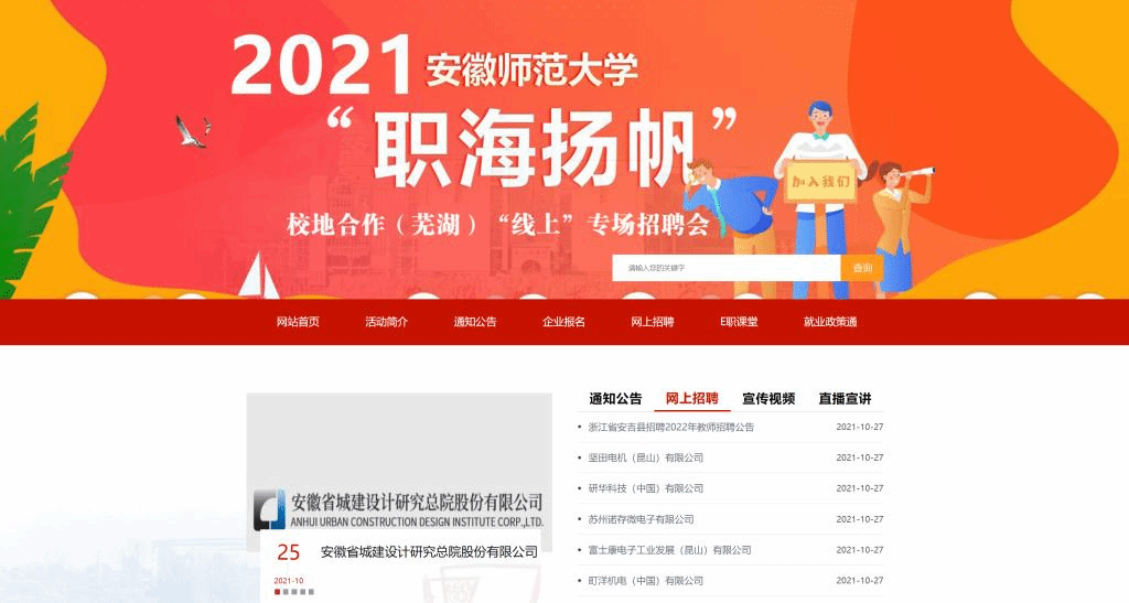 2021年“职海扬帆”校地合作(芜湖)“线上+线下”专场招聘会成功举办。来自京沪苏浙皖等地的科大讯飞、海螺集团、国美电器集团等世界和中国500强企业,以及安徽省旅游规划设计研究院、安徽省城建设计研究总院、安吉县教育局等119家优质企事业单位应邀参会,其中线下招聘单位60家,1100多个招聘岗位涉及文化、教育、设计、科技等多个门类。招聘会现场和线上招聘平台吸引了全校毕业生的到来。
