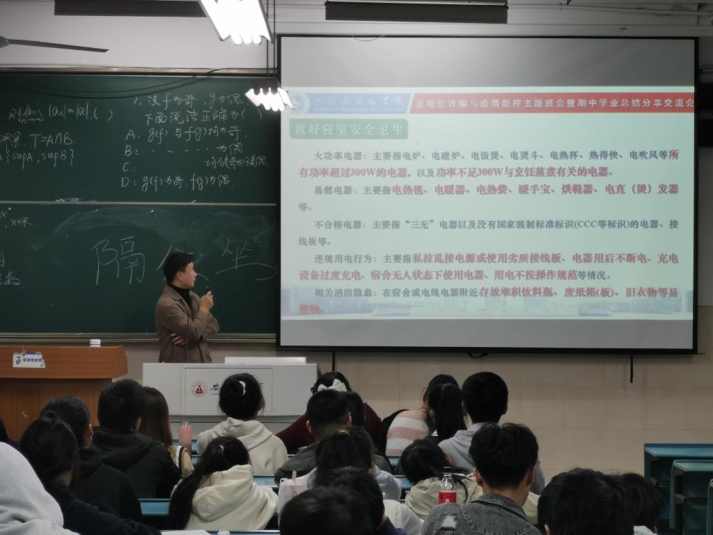 接着,刘少杰就“确保寝室安全卫生”、“当前疫情防控形势”、“及时做好疫苗接种”以及“压实疫情防控责任”等方面给大家做好全面提醒同时提出要求,要求同学们严格按照学校规定不得在宿舍使用违规电器;认真做好日常寝室卫生和教室卫生清洁工作;积极做好疫苗“加强针”接种的工作准备;严格落实师生晨、午、晚检制度,按照“一人不漏、一次不少”原则,实行“包保责任制”,寝室长包寝室,班级主要干部包班级。最后,刘少杰强调:每位同学们都要认真学习此次会议内容,不断提高自己的防诈骗能力,严格遵守校规校纪,各个班级要不断加强日常管理,严守安全底线,确保每个同学在安全稳定的环境中学习和生活。