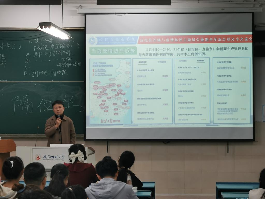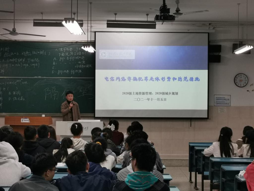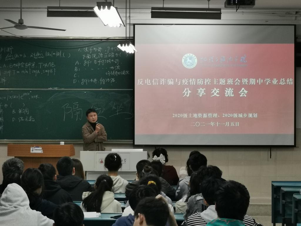 刘少杰 张楠)为进一步加强学生的安全教育管理,提高学生的防诈骗意识,营造平安和谐稳定的校园环境,11月5日晚,20级城乡规划和20级土地资源管理专业召开“反电信诈骗与疫情防控”主题班会。此次会议由辅导员刘少杰主持,20级城乡规划和20级土地资源管理专业全体学生参与。