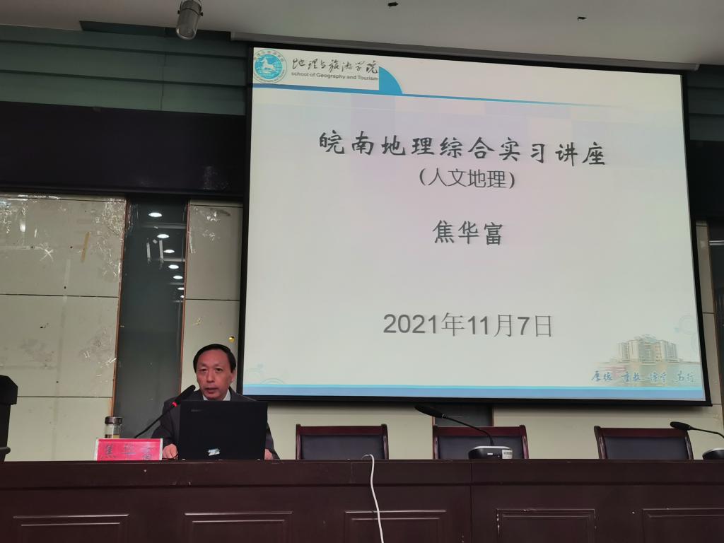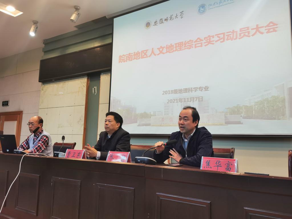 实验楼101报告厅举行皖南地区人文地理综合实习动员大会暨皖南实习专业讲座“线上+线下”会议。动员大会上,副院长曹卫东强调了皖南地区实习的重要性;党委副书记乔静就防疫工作、实习安全及纪律问题向同学们提出要求;实习指导教授焦华富、吴立分别从人文和自然地理角度出发,详细介绍皖南地区风土人情和自然地貌等特征,收获底下同学们阵阵掌声。