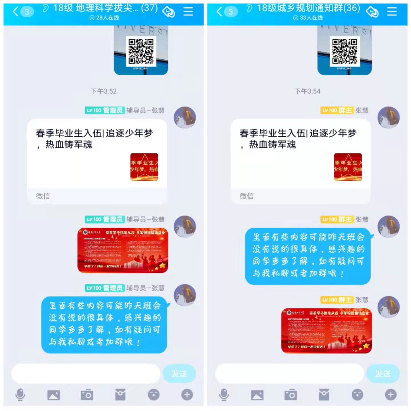 本网讯(文/张慧 图/潘爽)为全面贯彻落实习近平强军思想,切实做好2022年春季大学生应征入伍宣传工作,增进同学们对征兵入伍政策的了解,从而提高兵员征集的数量与质量。11月30日晚7点,2018级城乡规划及地理科学(非师范)专业在行知楼4号楼103教室召开2022届毕业生参军入伍主题班会。会议由辅导员张慧主持,2018级城乡规划及地理科学(非师范)专业全体同学参与会议。