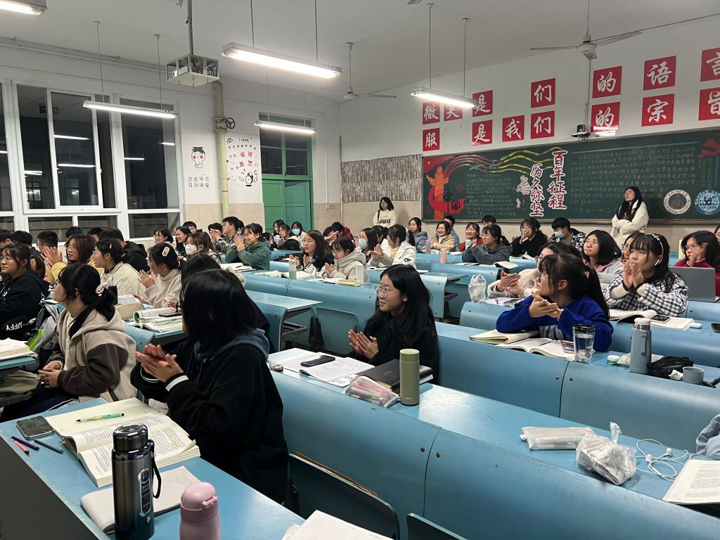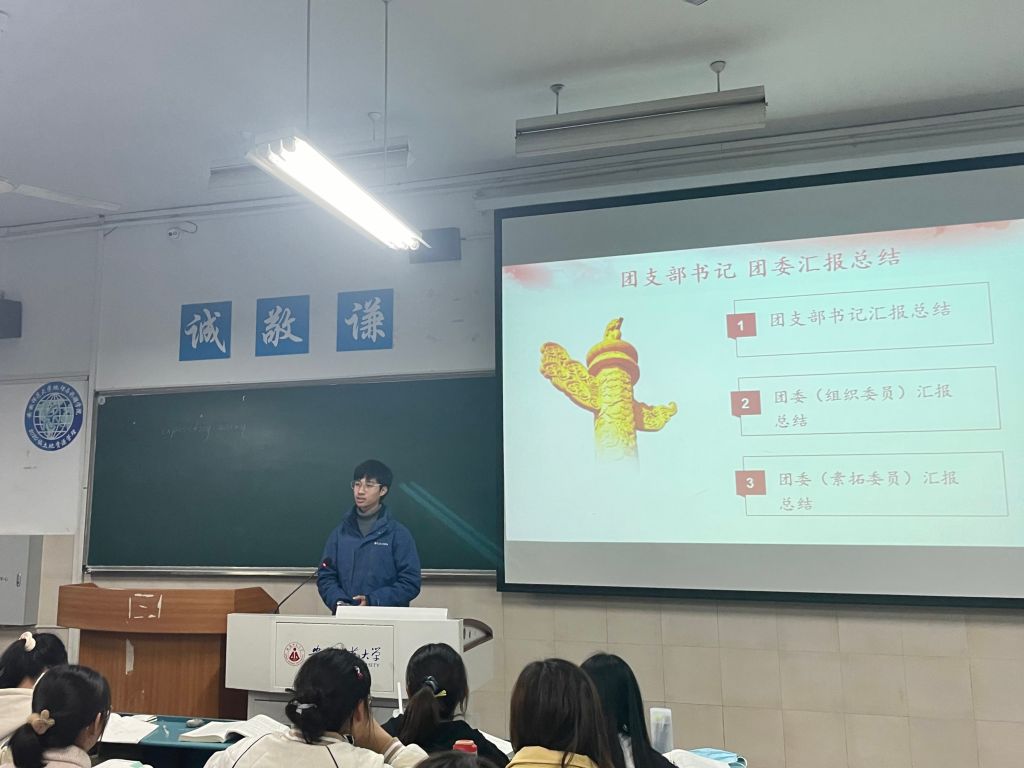 大会由四项议程组成。第一项是齐唱团歌。伴随着慷慨激昂的音乐,全体同学肃然起立,齐唱团歌。待同学们坐下后,第二项团支部委员会做工作汇报总结。团支书黄倩、团委组织委员张悦、团委素质拓展委员侯佳、团委宣传委员陈谊依次站上讲台,就本学期开始以来的各项工作状态进行工作汇报,向同学们展示近期工作进展和成效,并表达竭心尽力为同学服务的初心使命。第三项议程为优秀团员民主评议结果公布。会前经过团委组织,全体团员通过个人自评、团员互评和组织评价相结合的方式开展团员教育评议,最后选出优秀等次、合格等次的团员。大会第四项为参会91论坛