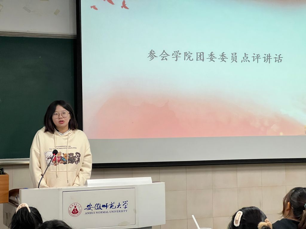 团委委员点评讲话。团委组织委员周咏恬全程参与我支部大会,并提出几点意见,其中包括在唱团歌时部分同学不熟练、团支部大会流程存在问题、团支部内群众数量仍较多等。此后,辅导员韦银艳老师也进行了点评,主要针对院团委委员提出的问题进行批评指正,鼓励青年大学生要牢记时代使命,争做有为青年。