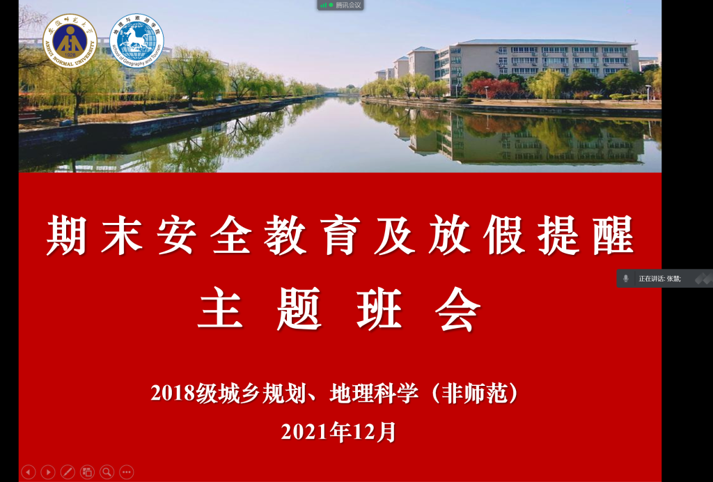 (本网讯 张慧)为做好期末安全教育,增强学生安全防范意识,12月27日晚上7点,2018级城乡规划及地理科学(非师范)专业在腾讯会议室召开期末安全教育及放假提醒主题班会。会议由辅导员张慧主持,2018级城乡规划及地理科学(非师范)专业全体同学参与会议。
