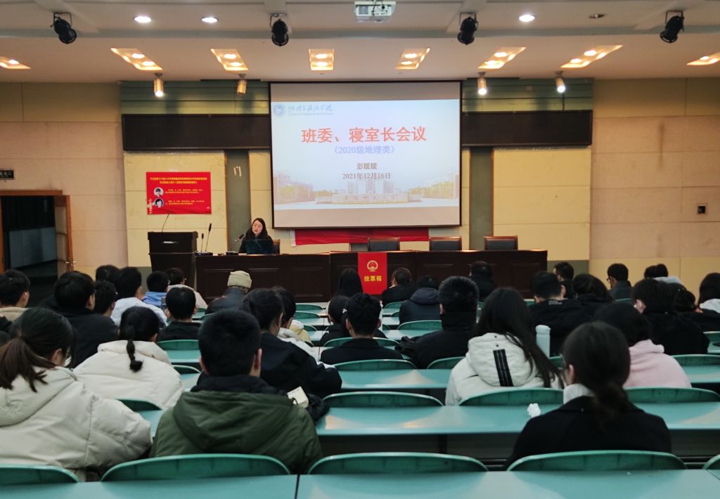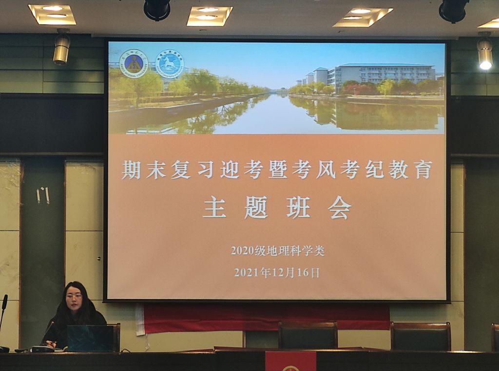 20211216日,2020级地理类各专业召开考风考纪教育暨期末及假期安全教育主题班会。会议由彭媛媛主持,2020级地理类全体学生参会。