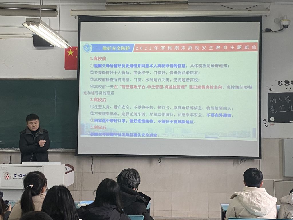 最后,刘少杰就关于寒假放假的相关信息进行了通报和提醒,对离校前的请假要求和离寝前的准备工作为同学们做详细说明,确保所有同学们安全离校,安全到家。同时,刘少杰提醒大家要充分利用寒假时间,主动学习、多与家人相处,在保证安全的前提下积极进行社会实践,丰富自己的假期生活。