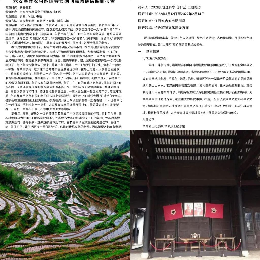 李喆同学对六安金寨的春节民风民俗进行了调研。陈欢同学则分享了家乡遂川县积极建设“红、绿、古”三色旅游名地的调研报告,对三色旅游的基本情况和发展变化进行了介绍。通过陈欢对家乡发展变化的讲解,同学们深刻体会到了在党的领导下人民生活焕然一新的改变。