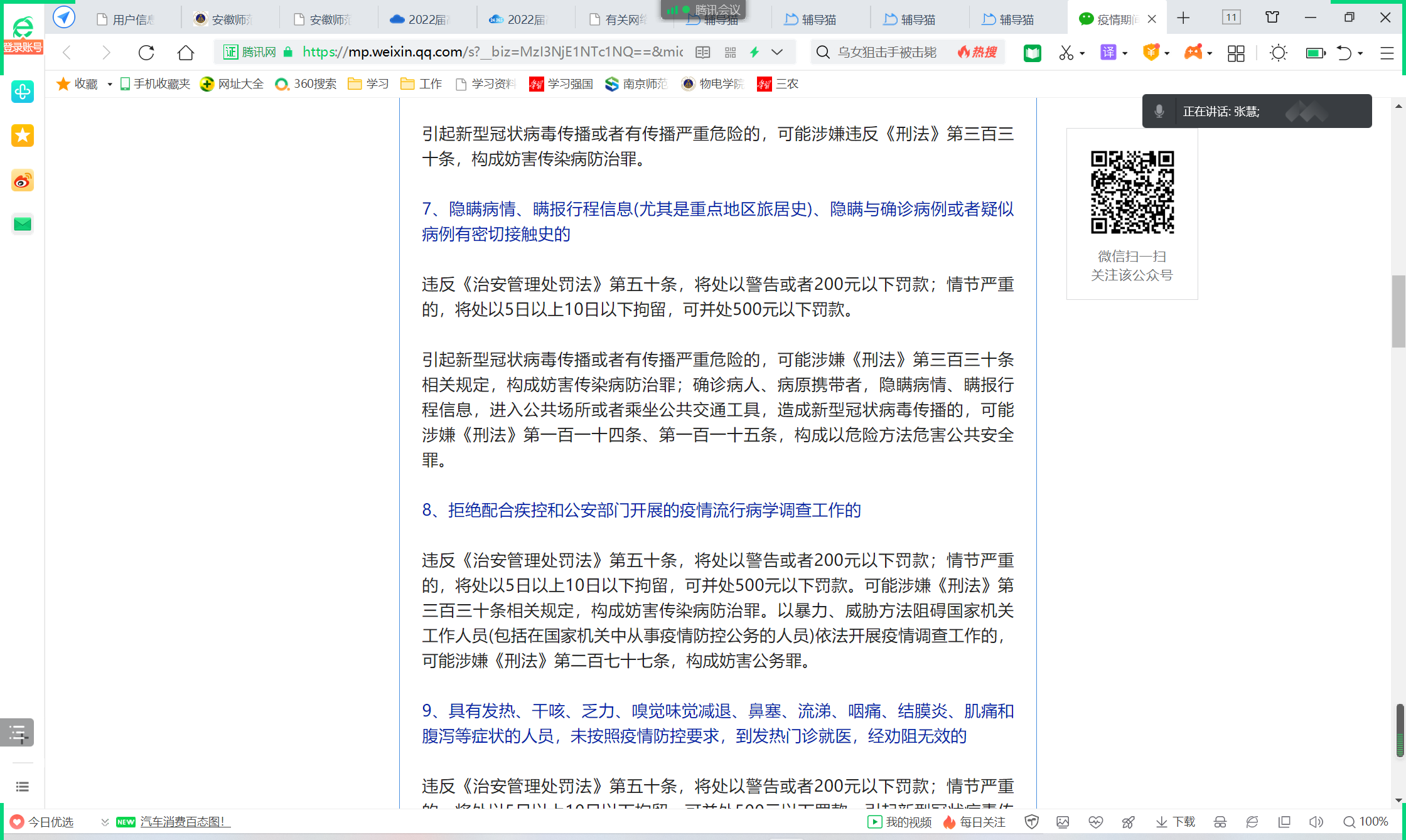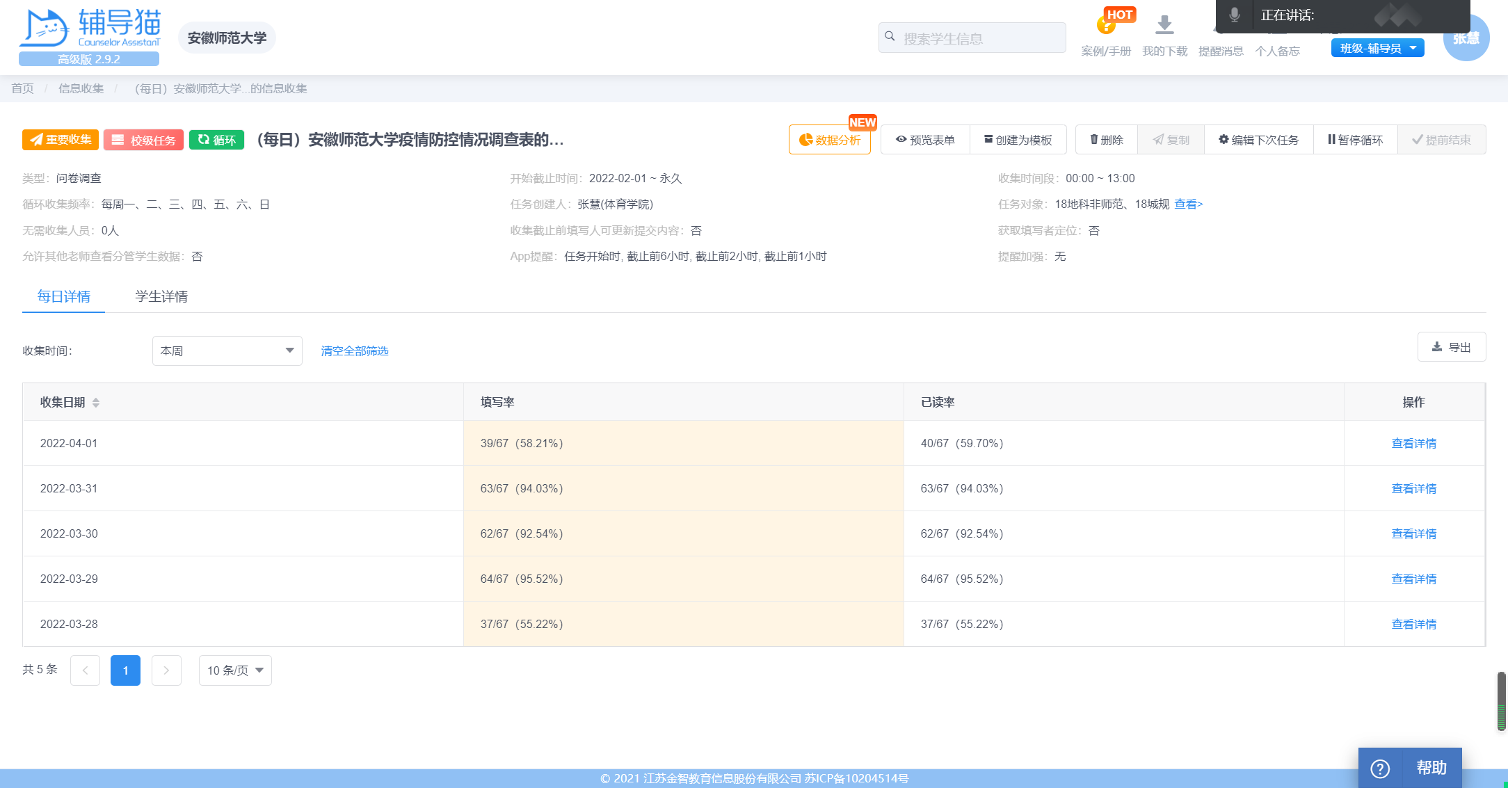 张慧首先向学生们介绍了清明节放假的相关通知以及放假时间调整的原因,倡导学生们在保障生命安全与身体健康的基础上积极参与校园文体活动。随后,张慧带领学生学习了30种疫情防控违法违规行为及法律后果与最新的校园疫情防控提示单,提醒学生做到知法守法懂法爱法,必须严格落实“晨午晚测温”、健康打卡、晚点名、请销假制度;她还通报了近期违反疫情防控要求典型问题案例,进一步告诫学生在做好自我管理的同时,成为身边人的“监督员”,保障每一个人的健康与安全。