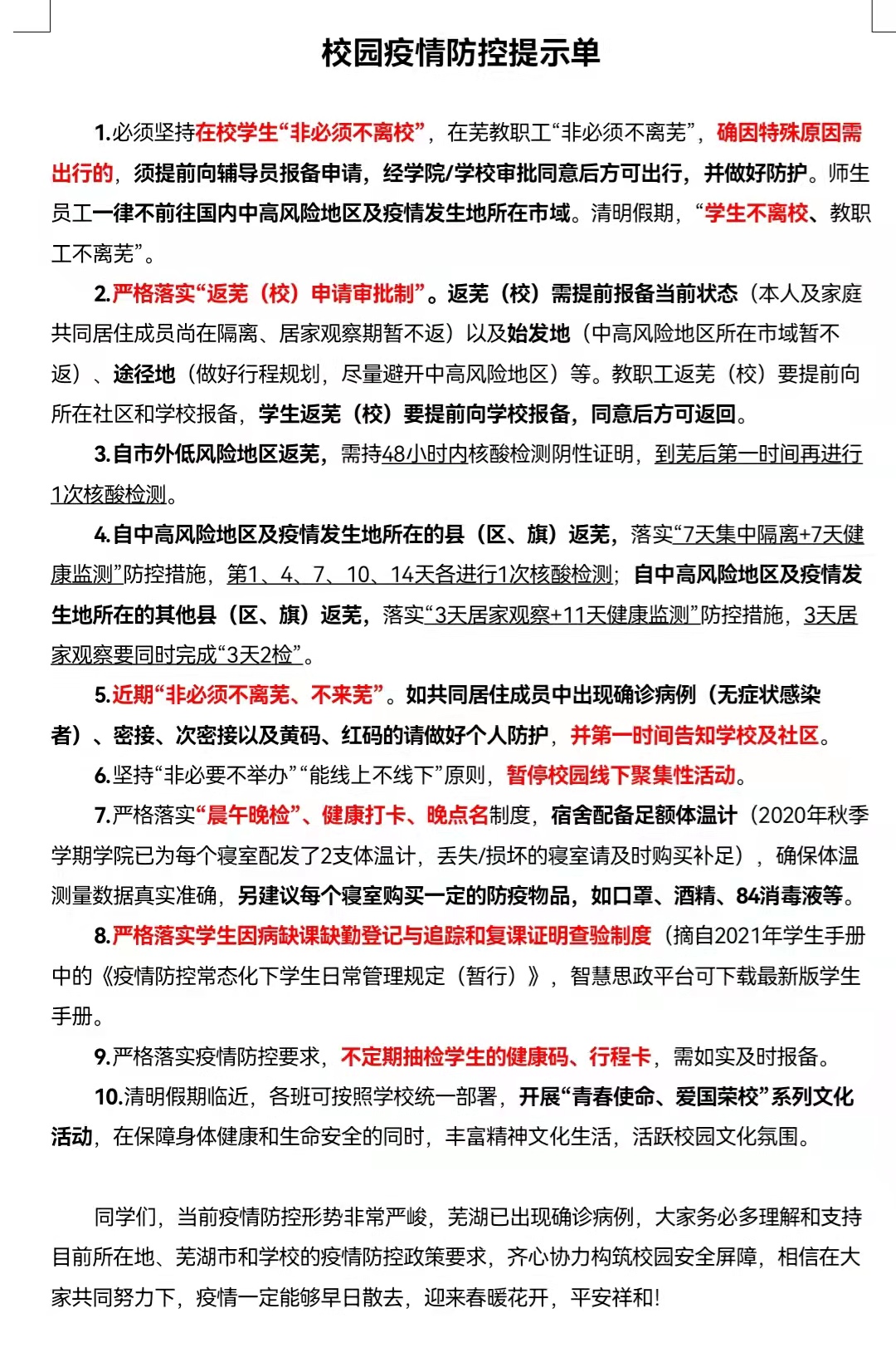 严格落实芜湖市和学校的疫情防控政策要求,保障学生身体健康与生命安全的同时,注重了解毕业班学生的实际需求,为其的升学或就业保驾护航。