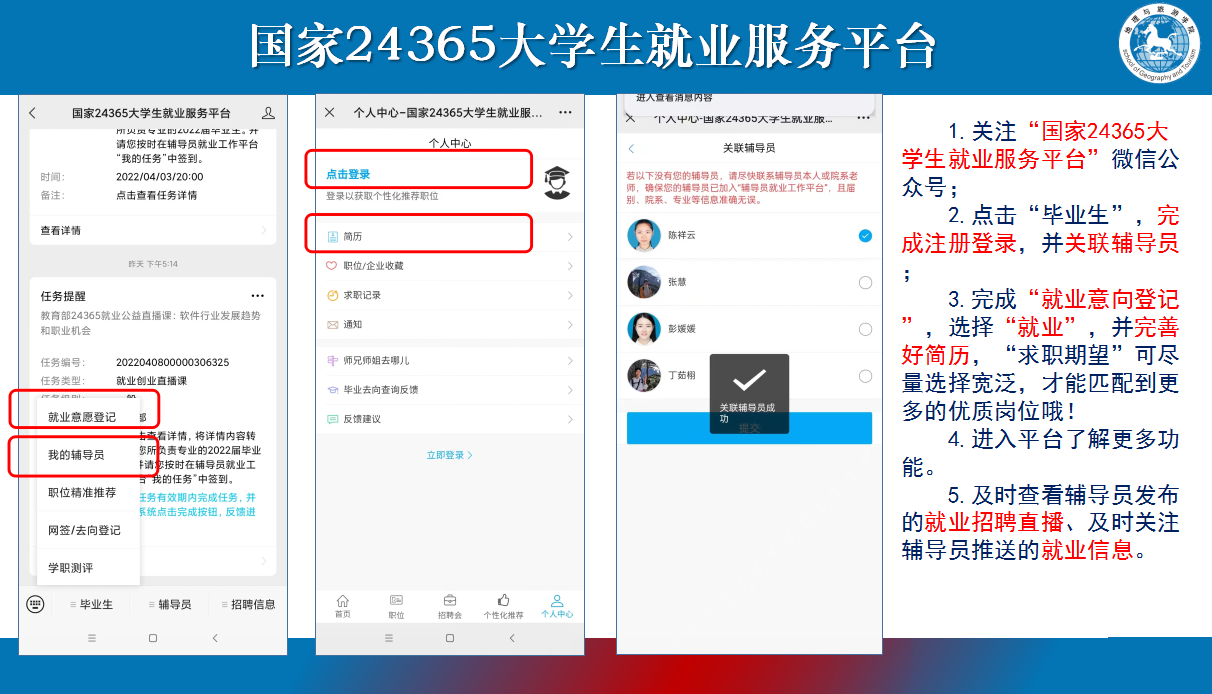 培训指导会上,陈祥云指导同学们关注“国家24365大学生就业服务平台”微信公众号,完成注册登录,并关联辅导员;完成“就业意向登记”,并完善好简历。此外,陈祥云还带领同学们进入平台了解更多功能,并提醒同学们及时查看辅导员发布的就业招聘直播等任务、及时关注辅导员推送的就业信息。