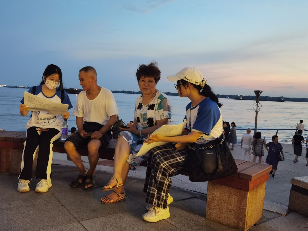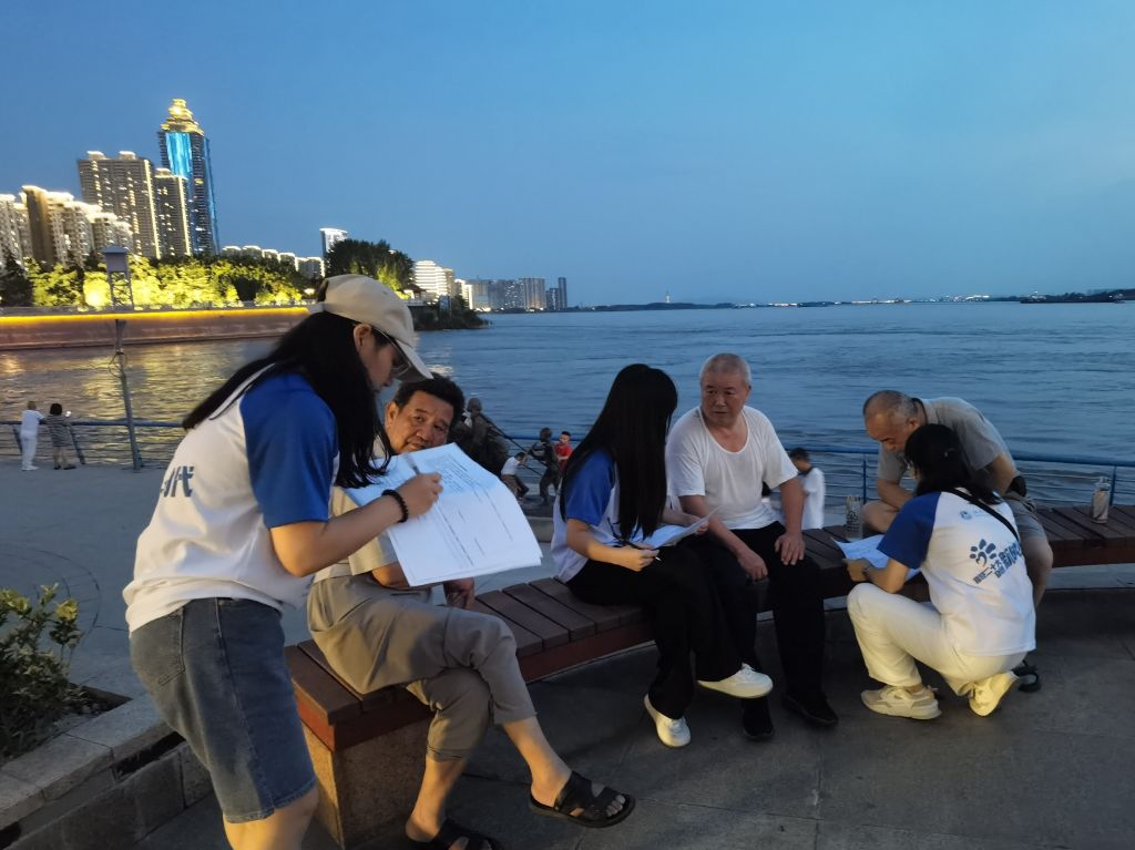 傍晚时分,长江边的天空泛起红霞,调研团队一行人来到芜湖市滨江公园中江塔下,开始对江边散步、乘凉的居民进行问卷调查。由于调查对象大部分是60岁以上的老年人,不便于自行填写问卷,于是队员们以聊天的形式向他们询问,细心解读各个问题,协助老人家完成问卷的填写。