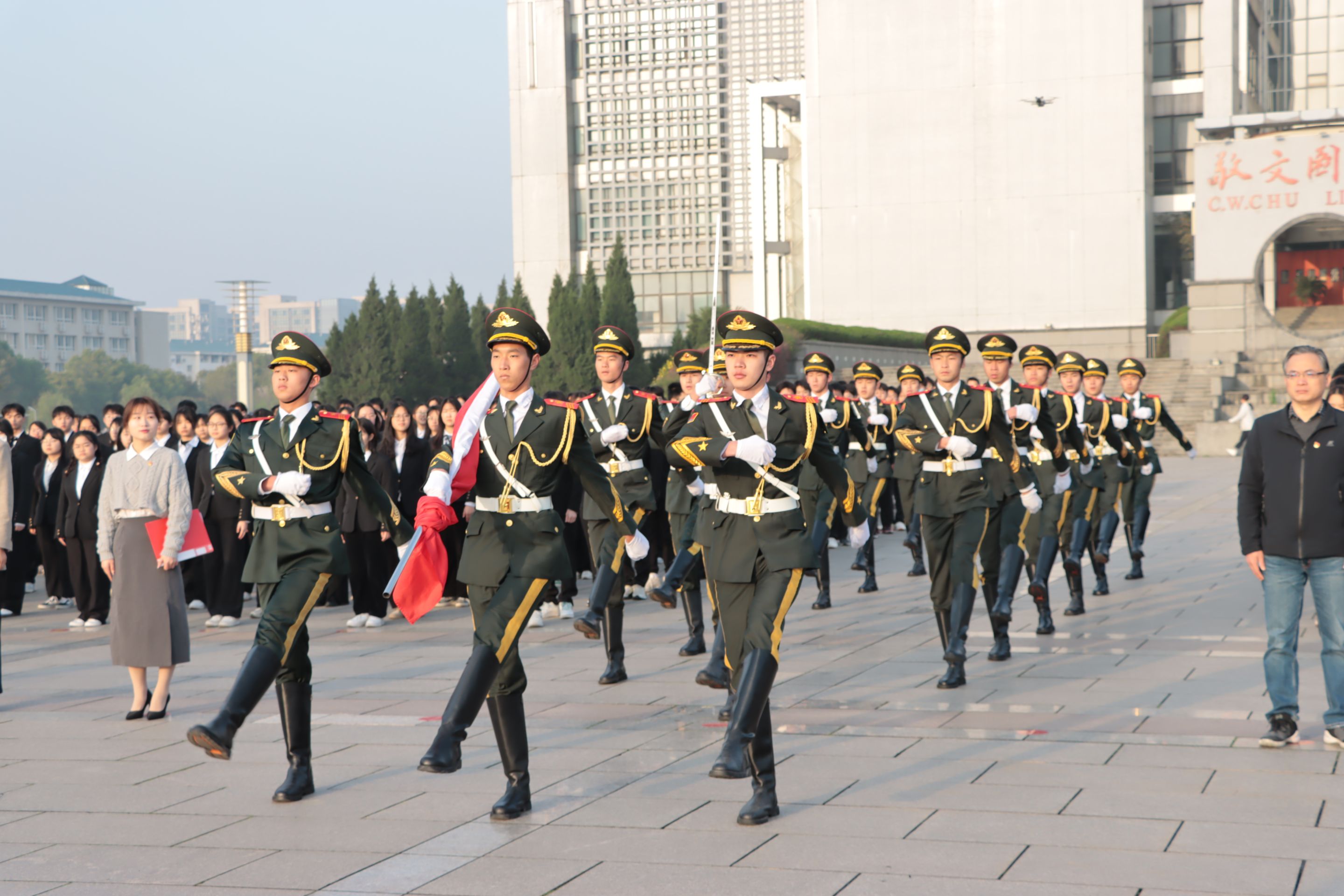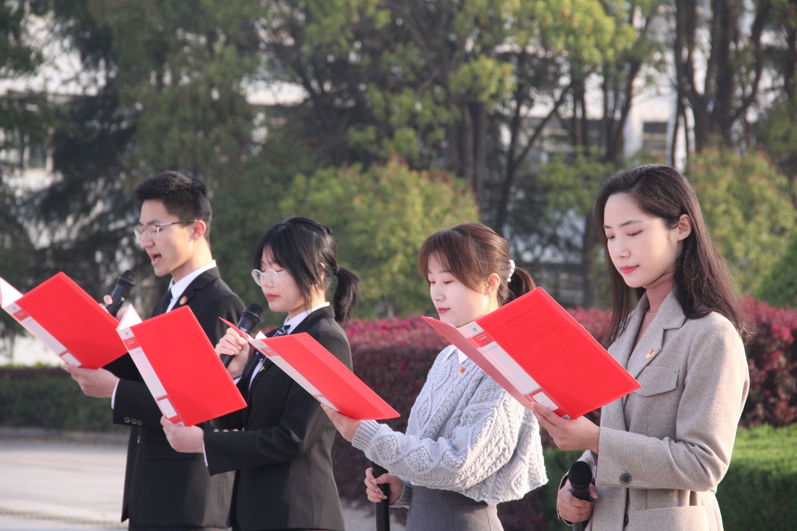 2022级辅导员陈祥云、谢园以及本科生张岳城、陈盈进行国旗下的朗诵——《我心中的中国红》。“我愿仰望星空,以鸿鹄之志许下民族复兴的誓言;我愿脚踏实地,以勤勉实干践行强国有我的决心”,振奋人心的朗诵词回荡在敬文图书馆东广场,激发了同学们的昂扬斗志。