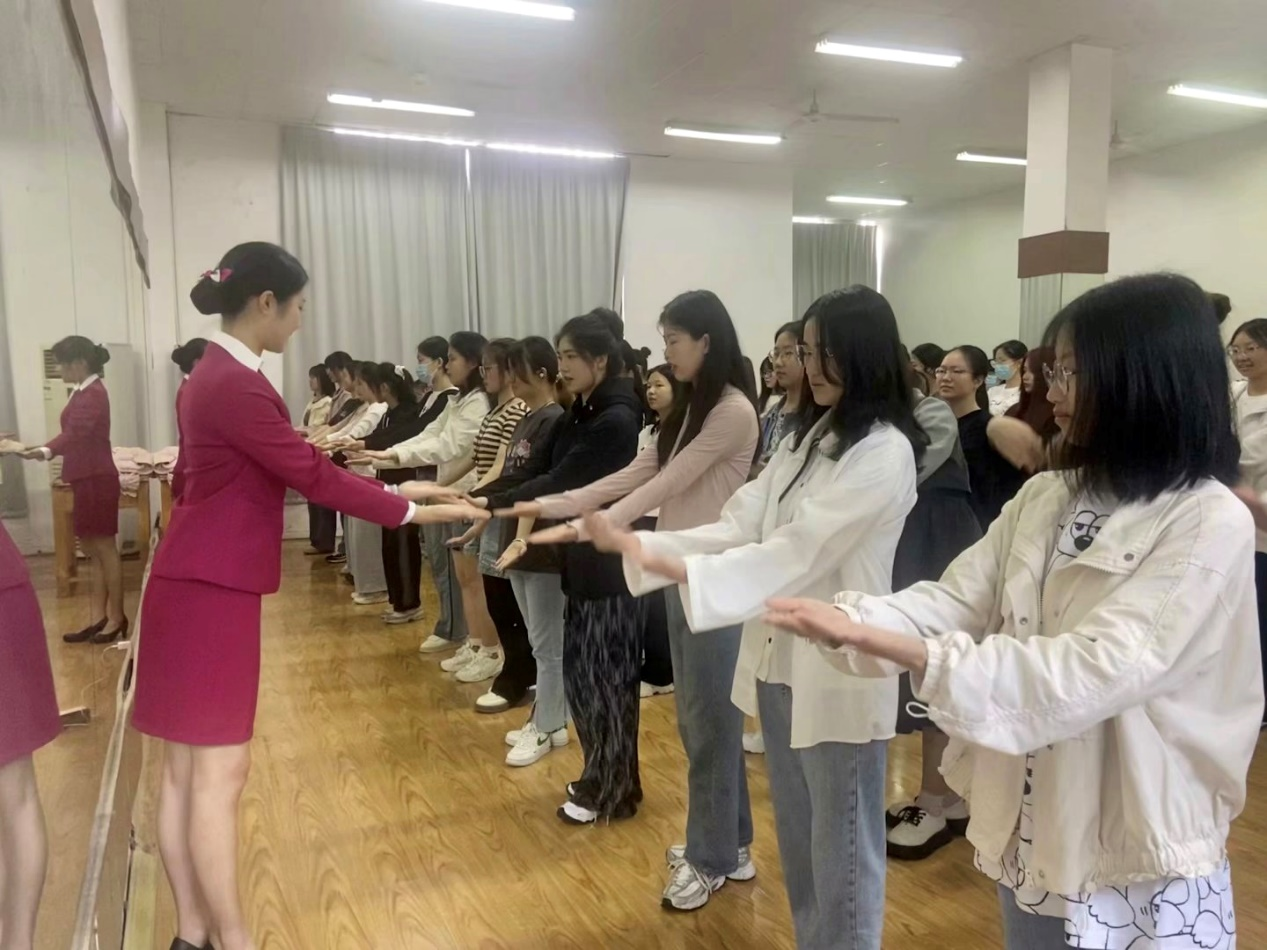 5月17日下午,地旅实验楼形体房内热闹非凡,同学们个个神采飞扬。活动以社团理事身着玫红色制服进行包括日常礼仪站姿、蹲姿、走姿的礼仪操示范和教学拉开帷幕。“脚呈丁字步站立,右脚在前时,左脚外开45度左右…”同学们跟着教学员的指示一步一步完成了礼仪操的学习。“脚再张开一点哦。”教学员在完成示范后,一一对同学们进行了动作纠正,确保每一位同学能学有所成,领悟到礼仪之真谛。注重仪容仪表和礼仪举止不是女性的专利,男性也应该学习日常礼仪知识。男理事身着黑色西装为男同学们进行引领的示范。同学们都一丝不苟的完成了每一个动作的学习。