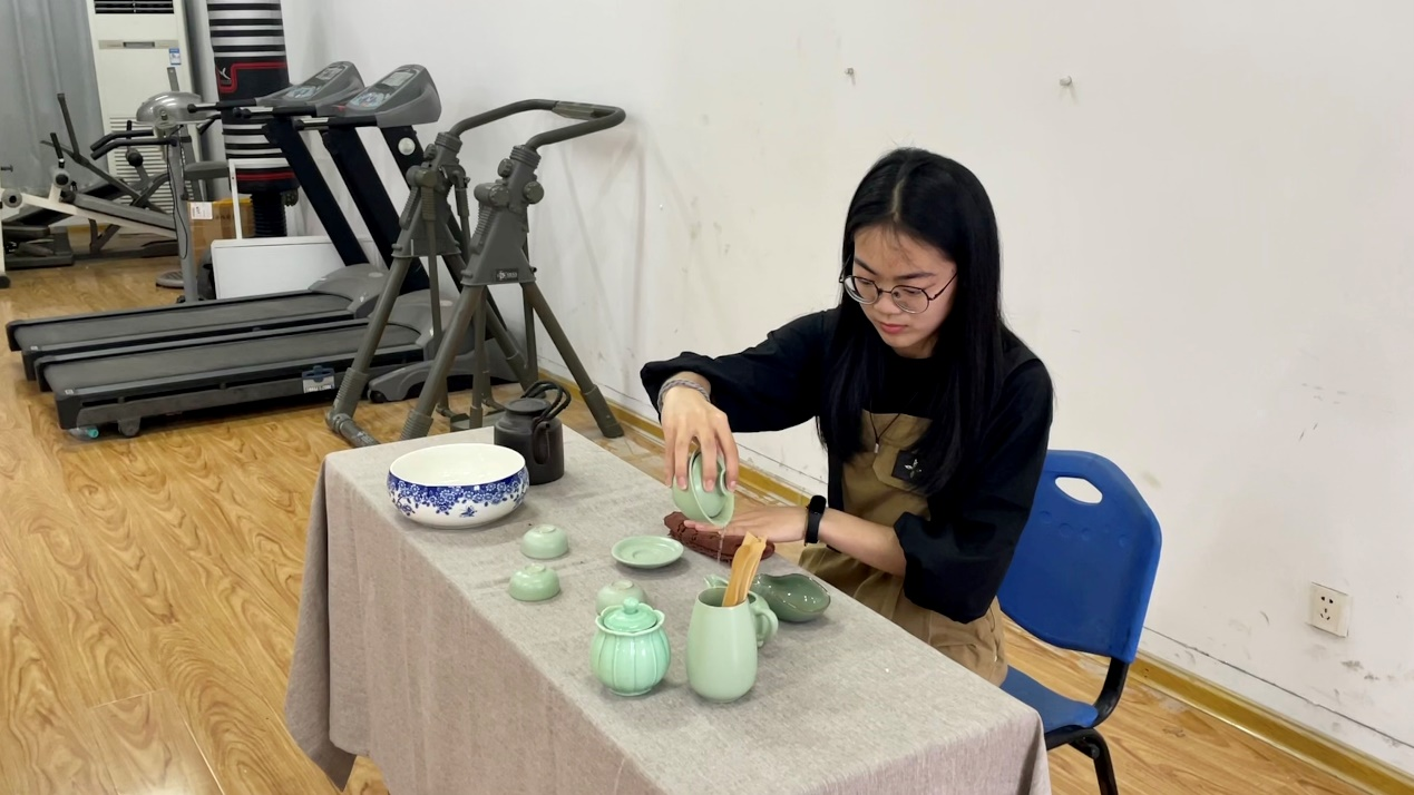 当日晚上,地旅实验楼的会议室座无虚席。一双双求知若渴的眼睛正目不转睛的看着前方的茶艺表演。身着白色茶水服的两位社团负责人一一向大家介绍茶具。“这是公道杯,用于均匀茶汤,鉴赏汤色。”只见茶壶在她们的手中轻盈的舞动,淡淡的茶香在她们手中被释放出来,弥漫整个会议室,让人感觉宁静又舒适。完成茶艺教学后,便有同学迫不及待的想要上前亲身体验一番。在泡茶的过程中,她的注意力始终集中在茶叶和水的交融上,仿佛在跟自然对话。